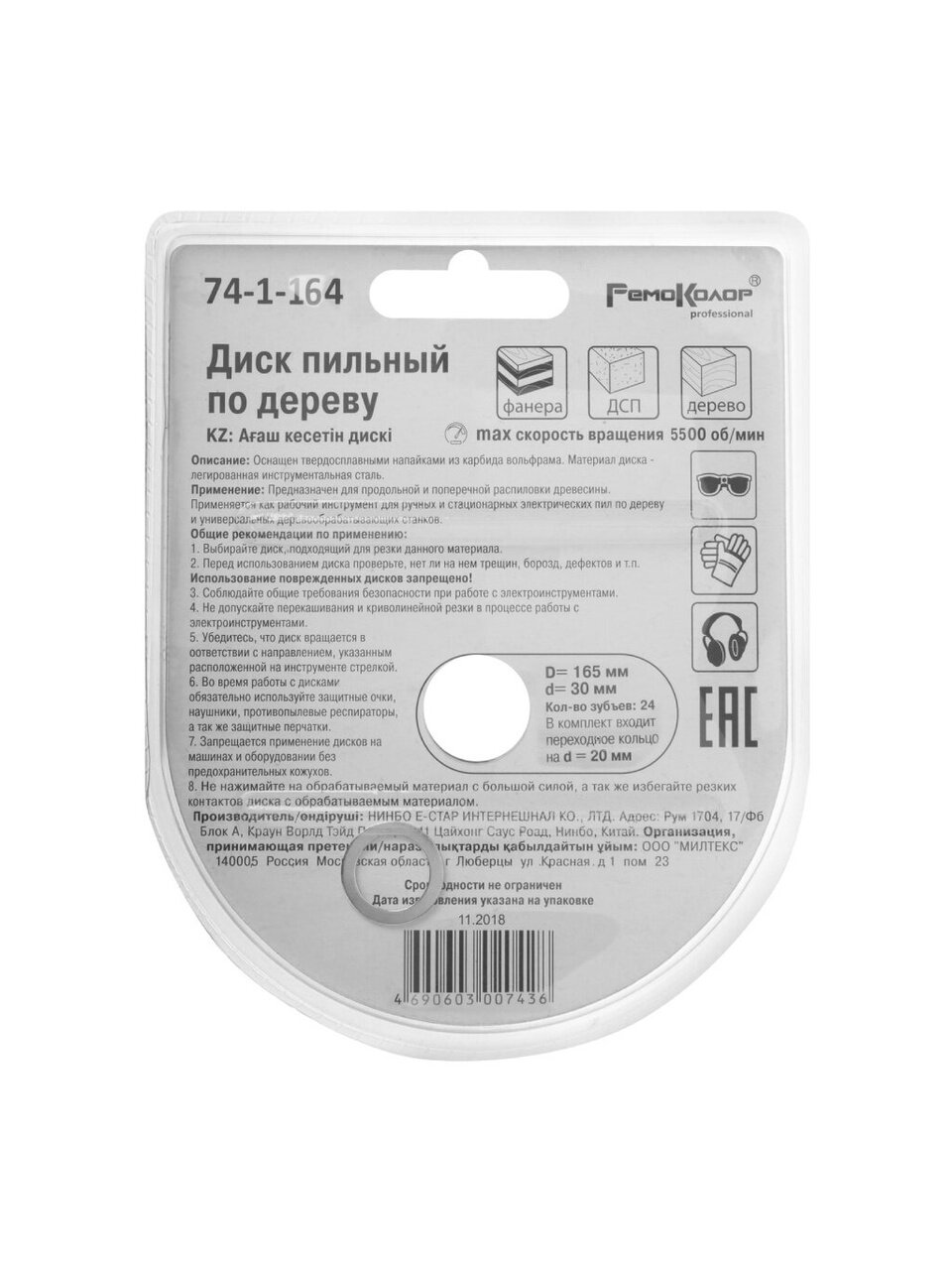 Вы можете приобрести «Диск пильный по дереву, РемоКолор, 165х30 мм, 24 зуба, + кольцо 20 мм, 74-1-164» и другие товары в нашем интернет-магазине в Ярославле по низким ценам и с бесплатным самовывозом.