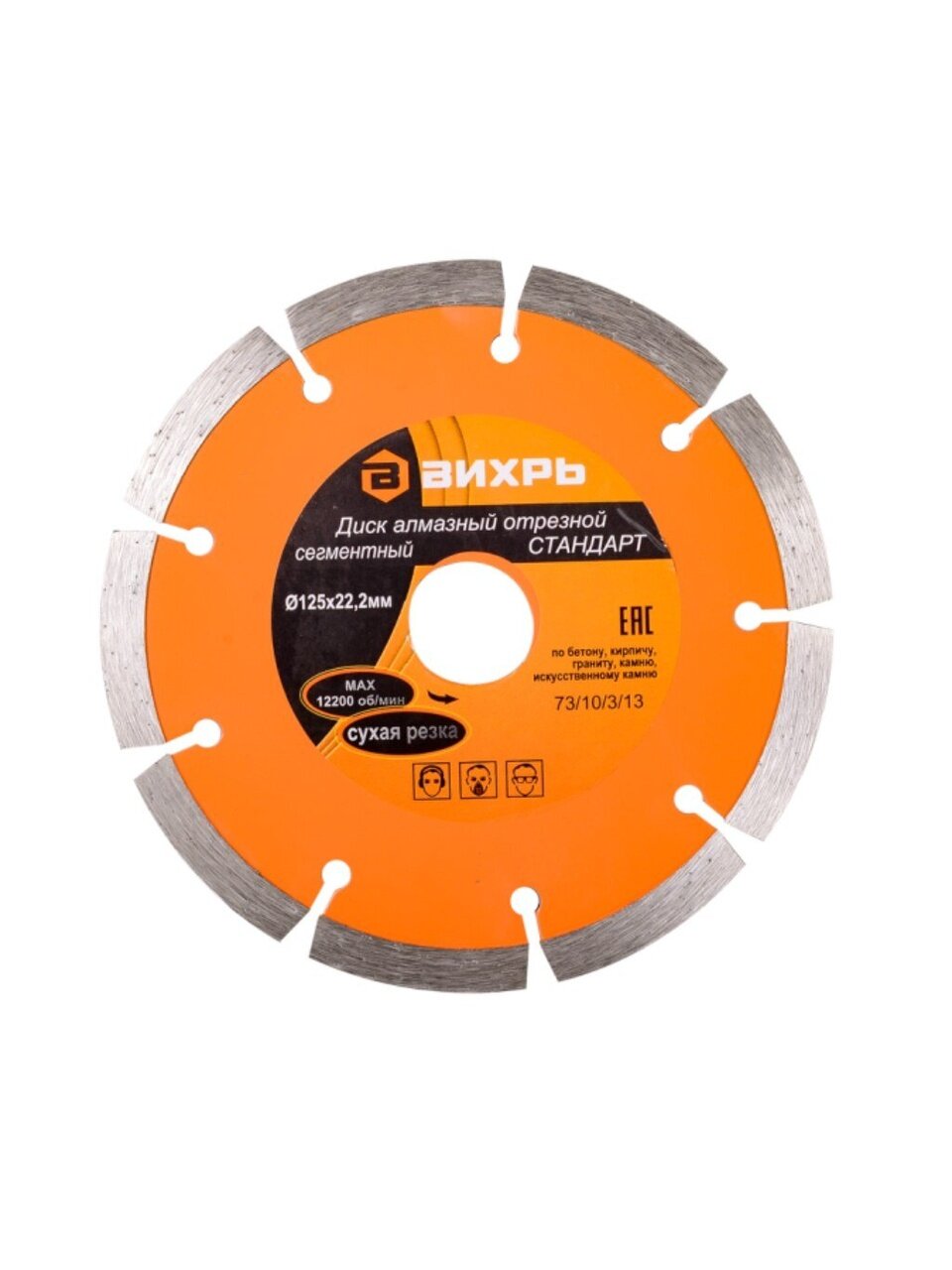 Диск алмазный отрезной сегментный Вихрь 73/10/3/2 предназначен для угловых шлифовальных машин и резчиков. Применяется для сухого реза по бетону, кирпичу, граниту, камню, искусственному камню.