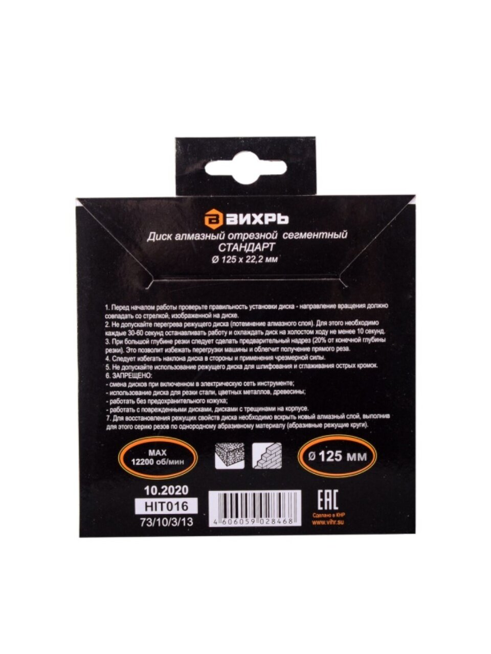 Вы можете приобрести «Диск отрезной алмазный по бетону, Вихрь, сегментный край, 125х22.2 мм, 9 зубьев, сухой рез, 73/10/3/2» и другие товары в нашем интернет-магазине в Коврове по низким ценам и с бесплатным самовывозом.