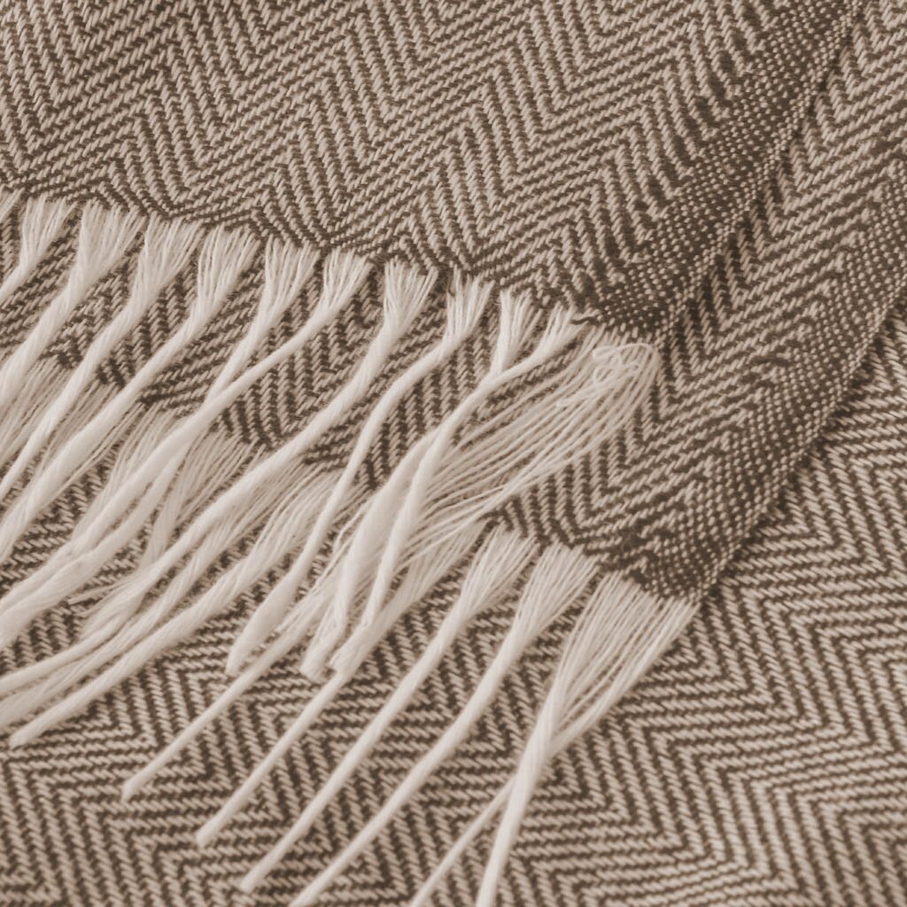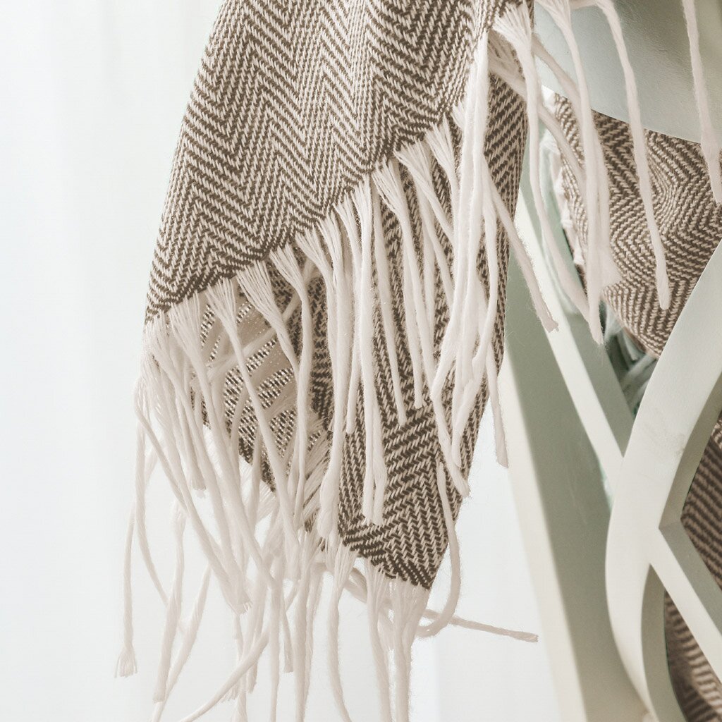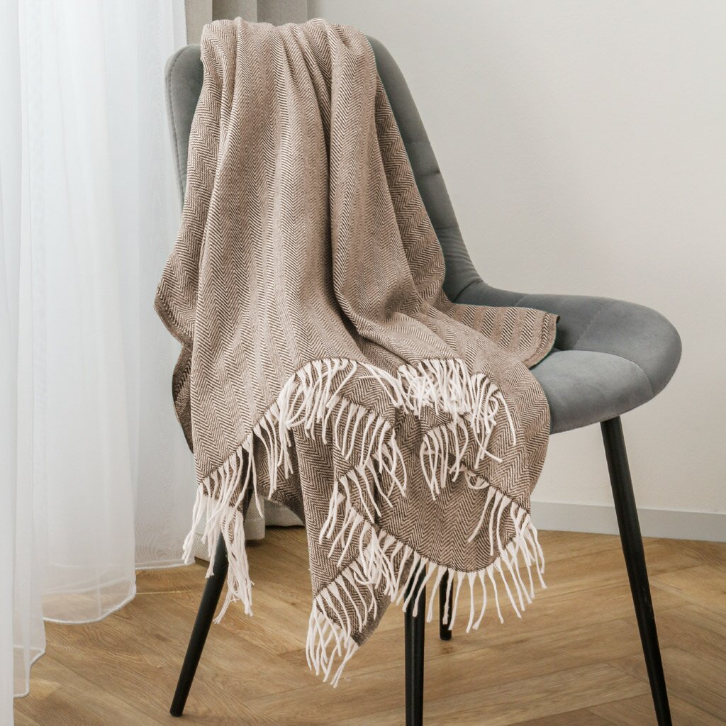- Двусторонний плед с орнаментом и бахромой — стильный акцент в интерьере и универсальность использования.
