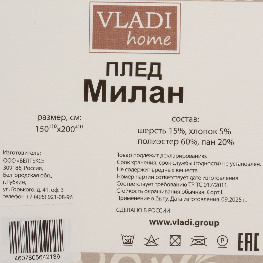 Плед 1.5-спальный Vladi Милан 150х200 см — уют и тепло без переплат: шерсть, хлопок и премиальный дизайн для дома, дачи, авто и подарка.