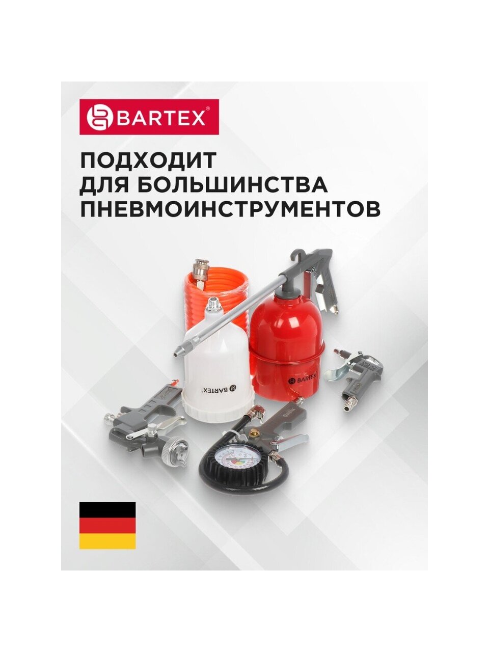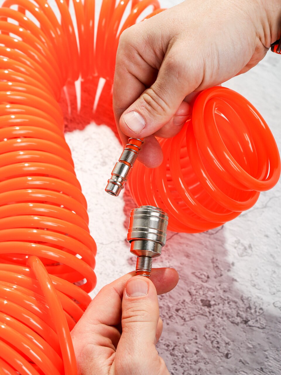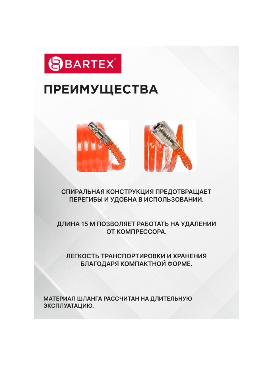 Шланг воздушный Bartex предназначен для подключения пневмоинструментов к компрессору. Длина шланга позволяет осуществлять работы в удаленном от компрессора месте. Спиральное исполнение предотвращает перегибы и увеличивает удобство при использовании и хранении.