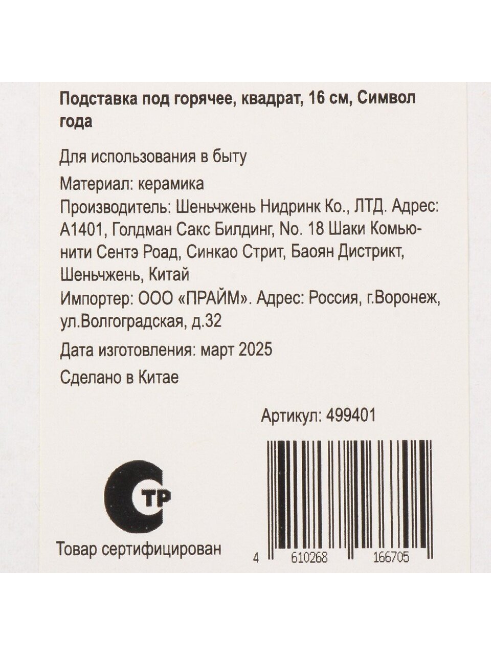 Вы можете приобрести «Подставка под горячее, керамика, квадратная, 16 см, Символ, Y4-9236» и другие товары в нашем интернет-магазине в Ярославле по низким ценам и с бесплатным самовывозом.