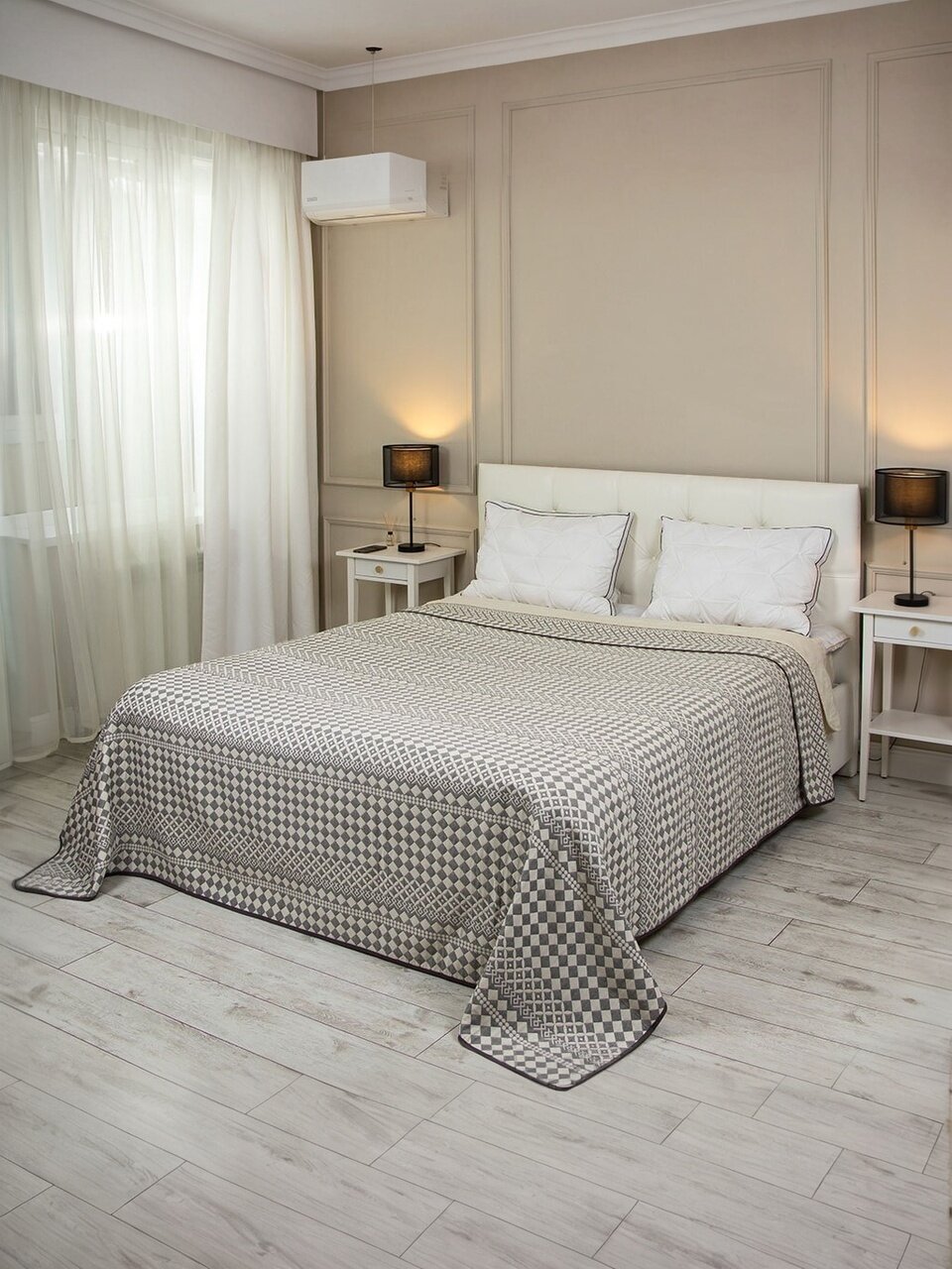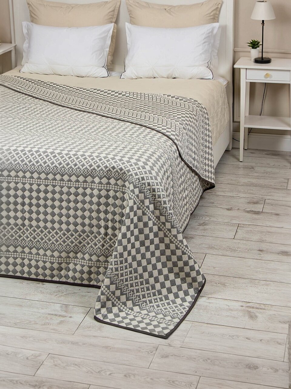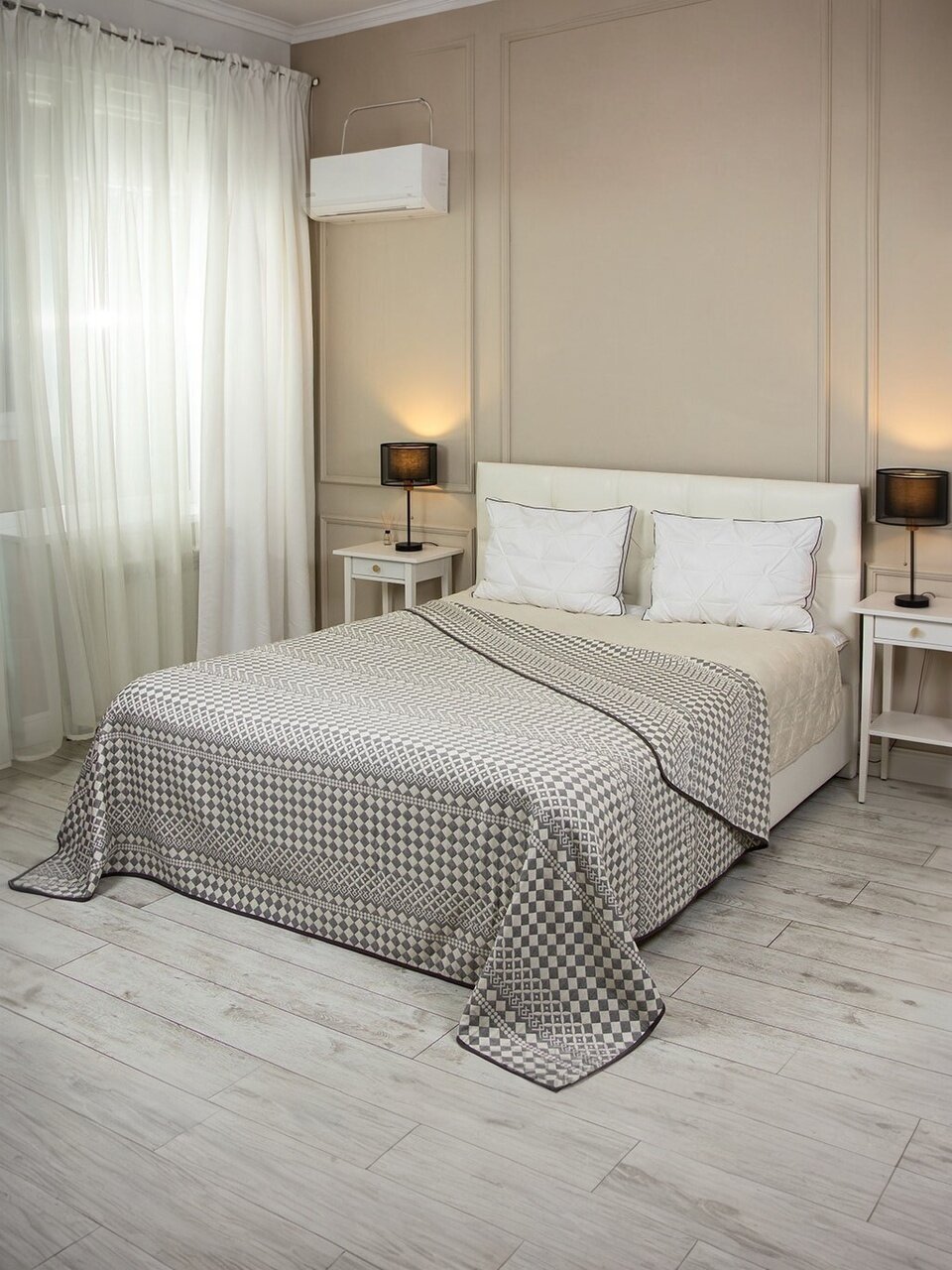 Покрывало Cleo коллекции "MELODY" выполненное в легких пастельных тонах, двухстороннее, без наволочек. Узор на ткани выполнен переплетением нитей.