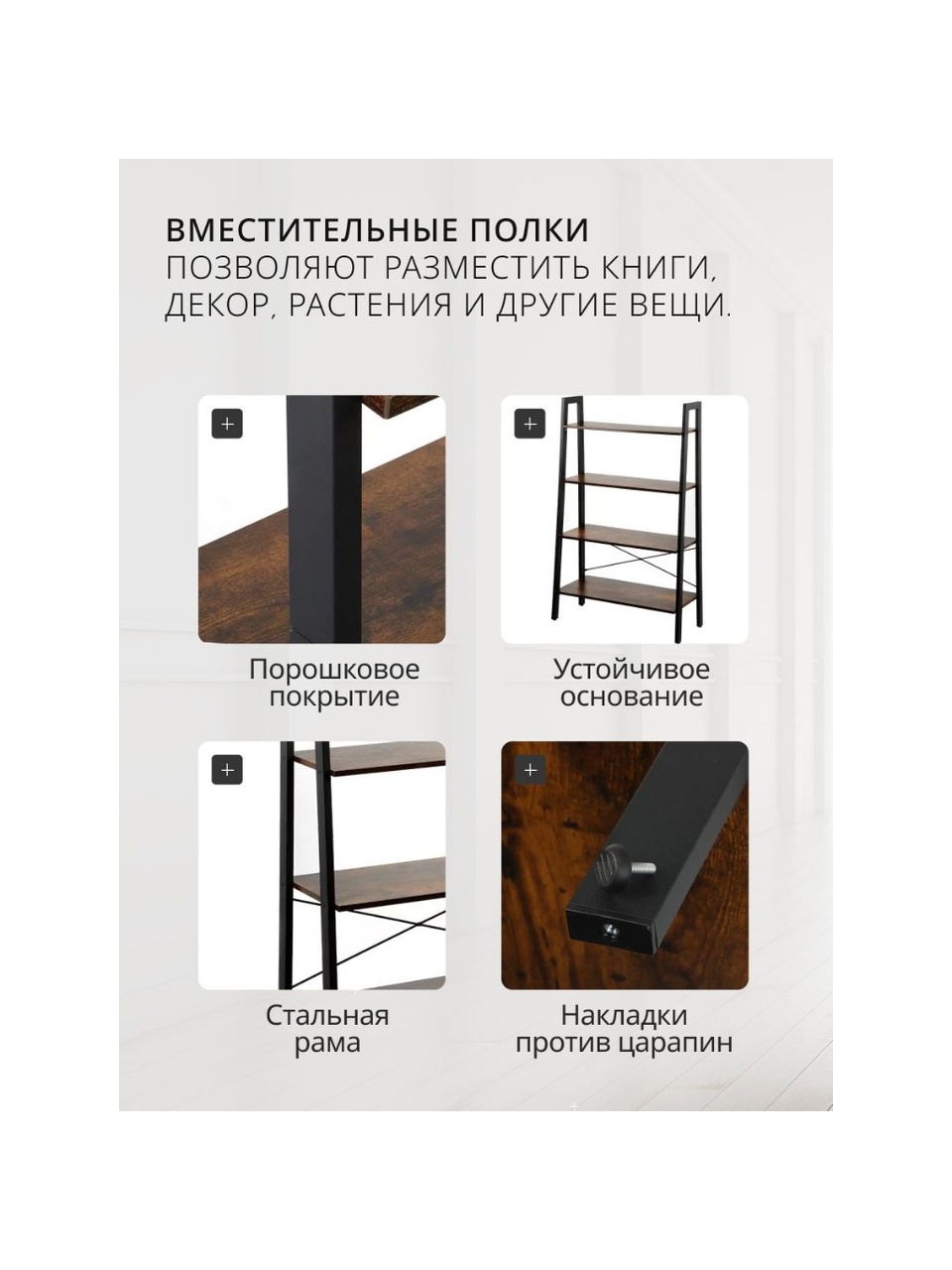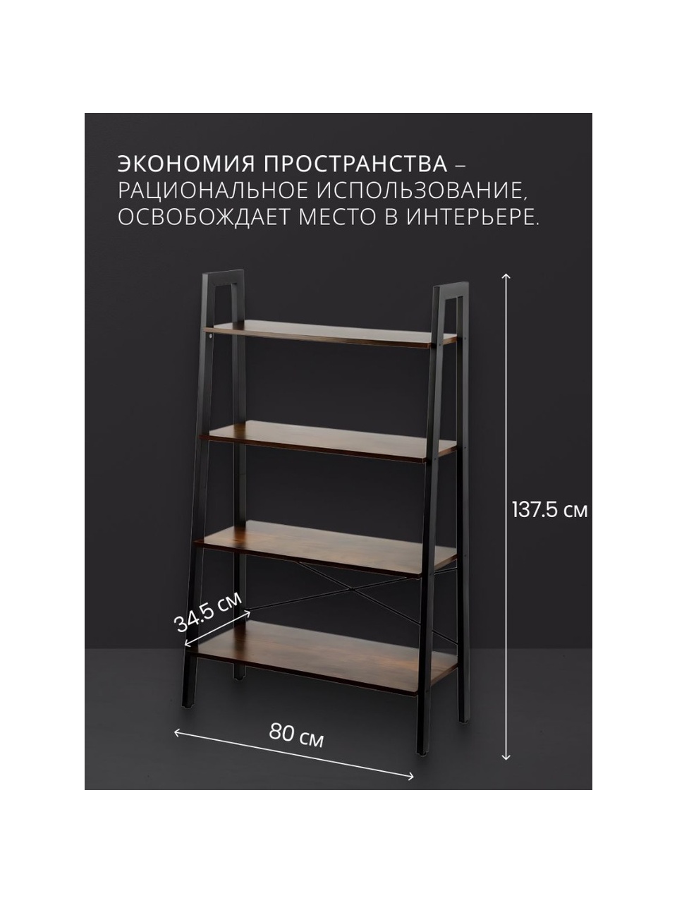 - компактные размеры: ширина 80 см, глубина 34.5 см и высота 137.5 см, что позволяет разместить полку даже в ограниченном пространстве;