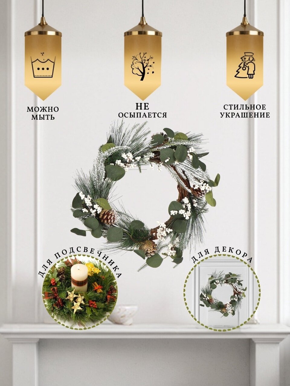 - Венок будет изумительно смотреться и на стене, и на входной двери, и как элемент новогодней сервировки, и как украшение подсвечника.