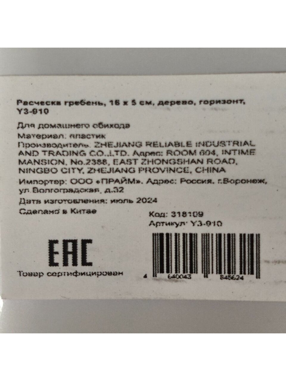 Расческа гребень, 16 х 5 см, дерево, горизонтальная, Y3-910