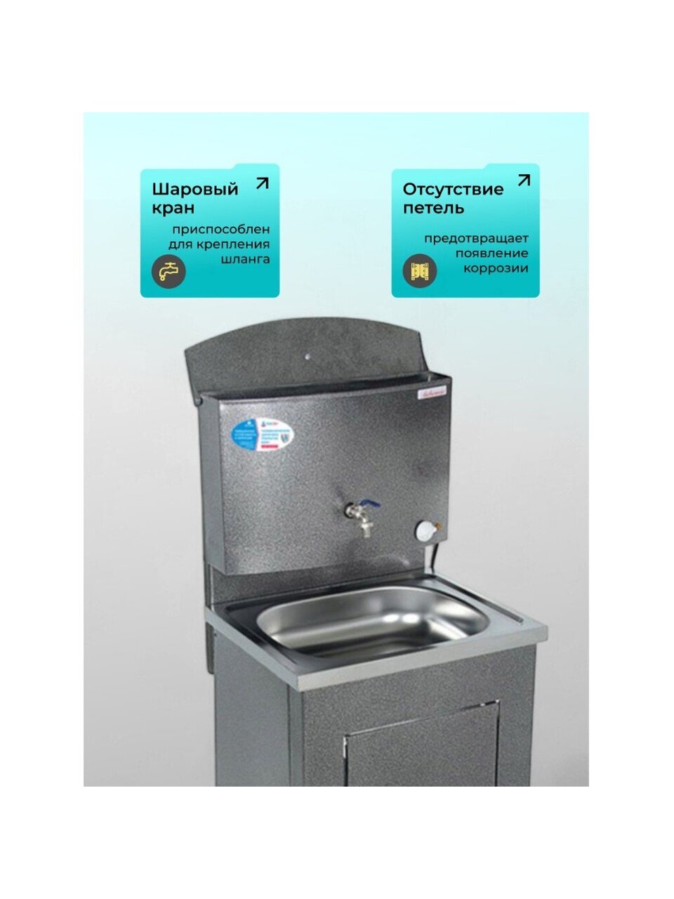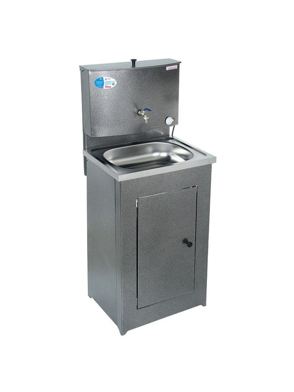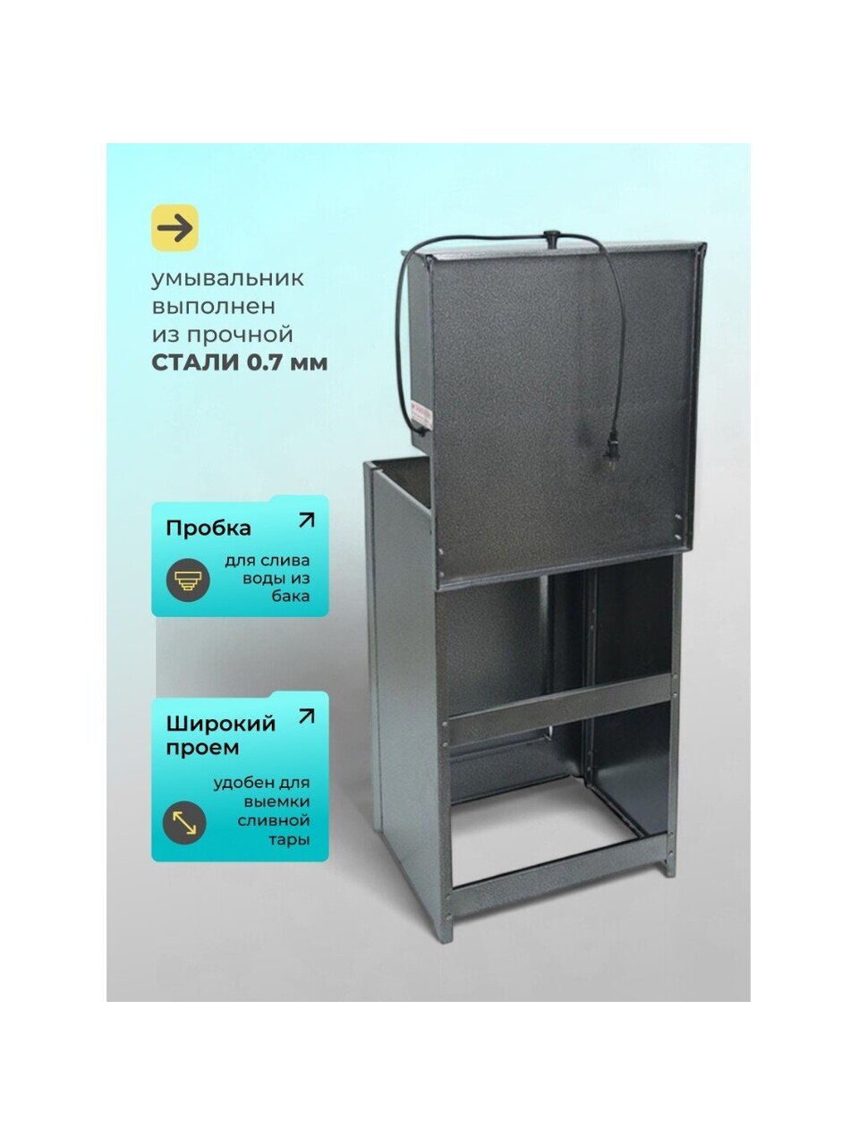 Конструкция умывальника сборная, состоит из бака с металлическим шаровым краном и тумбы, которая незаметно скрывает способ отлива воды и позволяет монтировать отвод воды как в закрытую емкость, так и в канализацию. Бак внутри обработан запатентованным противокоррозийным покрытием, которое гарантирует долговечность продукции и исключает возникновение ржавчины.