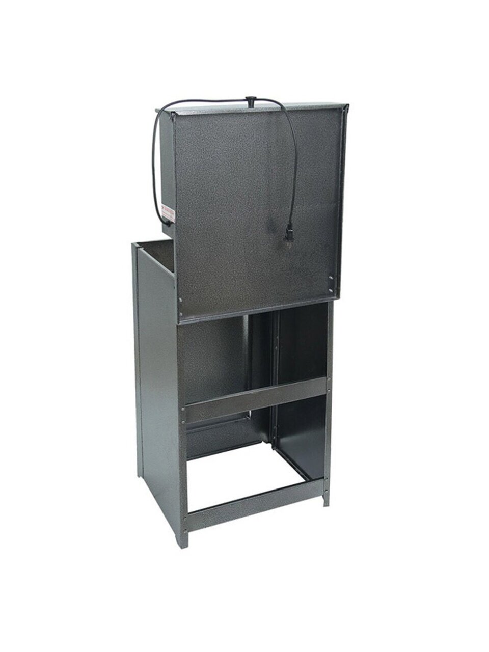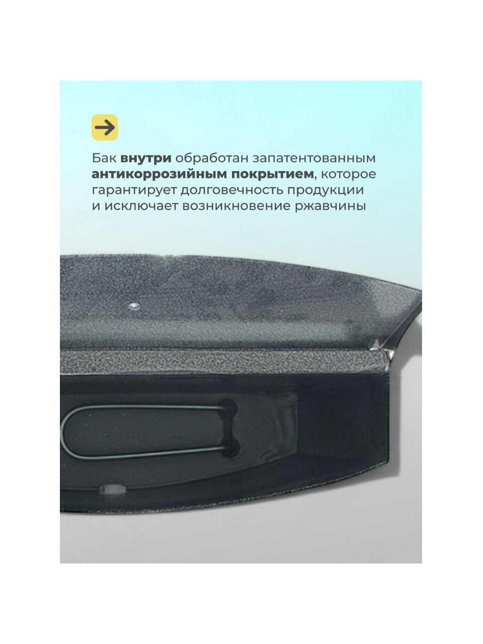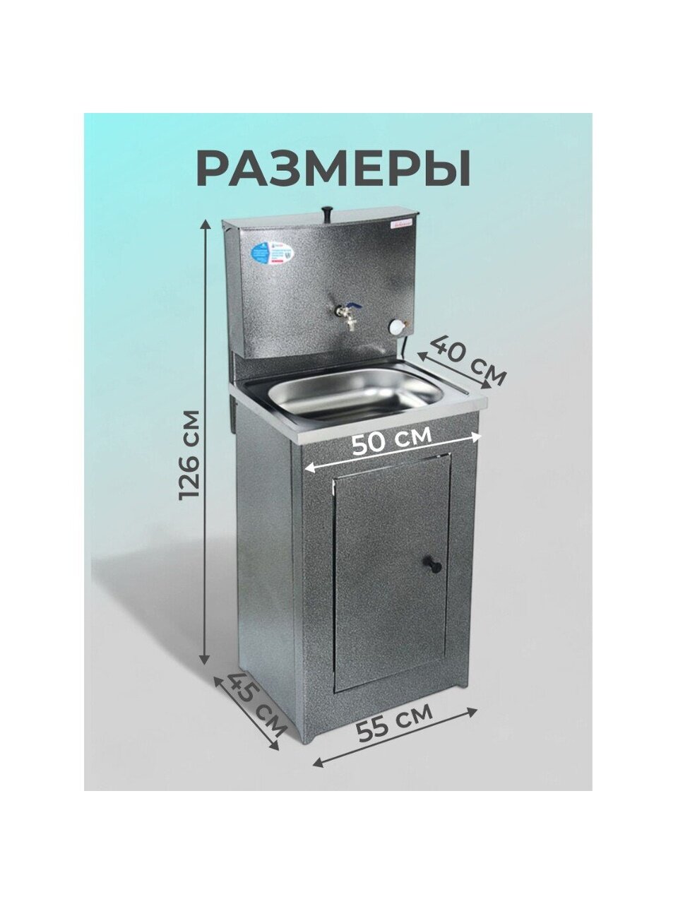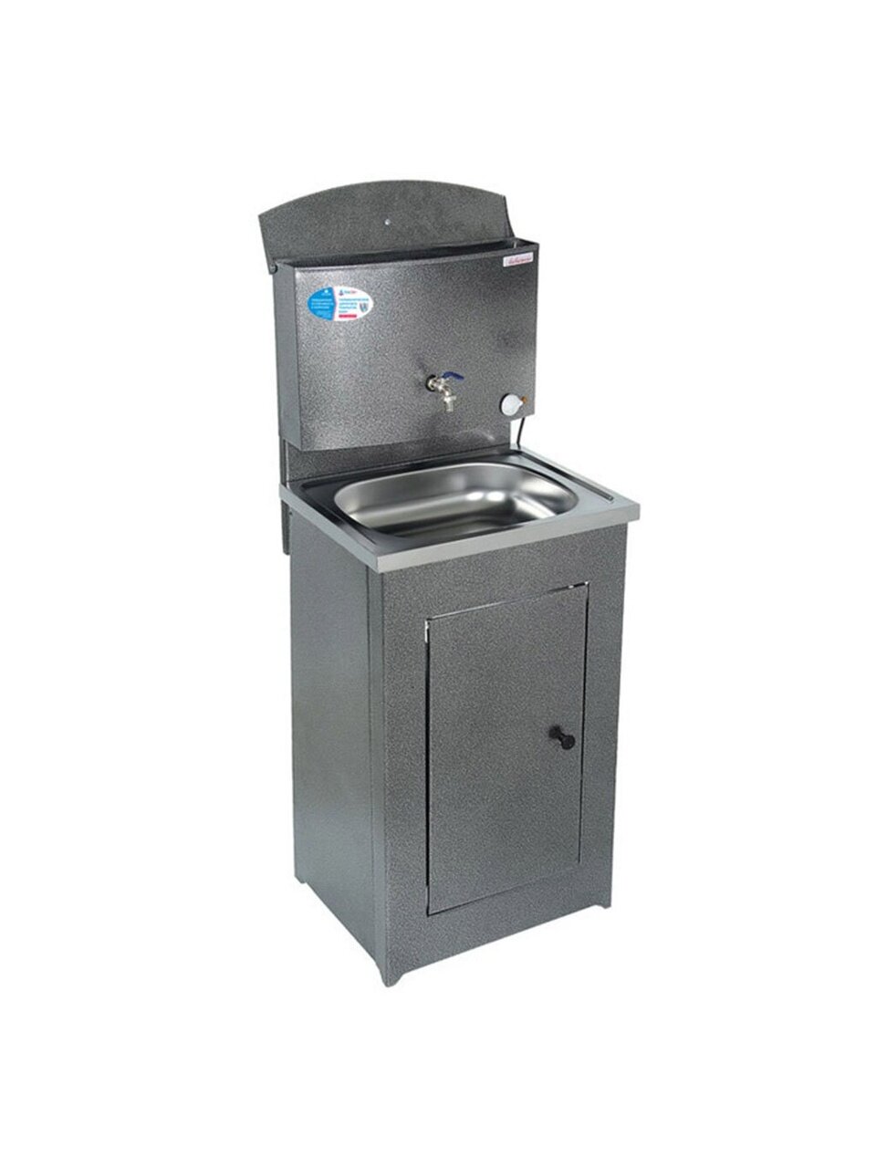 Конструкция умывальника сборная, состоит из бака с металлическим шаровым краном и тумбы, которая незаметно скрывает способ отлива воды и позволяет монтировать отвод воды как в закрытую емкость, так и в канализацию. Бак внутри обработан запатентованным противокоррозийным покрытием, которое гарантирует долговечность продукции и исключает возникновение ржавчины.