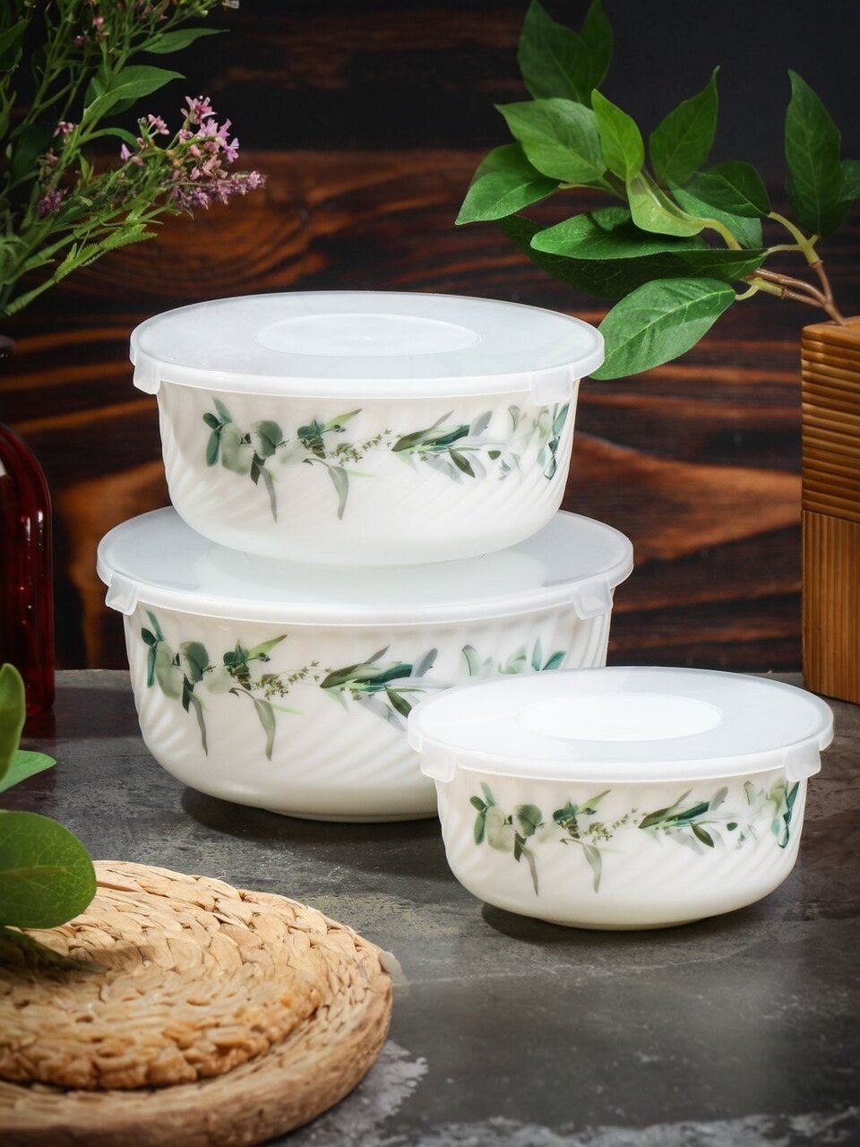 Салатники Daniks «Эвкалипт»: набор из 3 стеклокерамических мисок с крышками (0.5, 0.8, 1.4 л) — стильный выбор для хранения и сервировки дома и на даче.