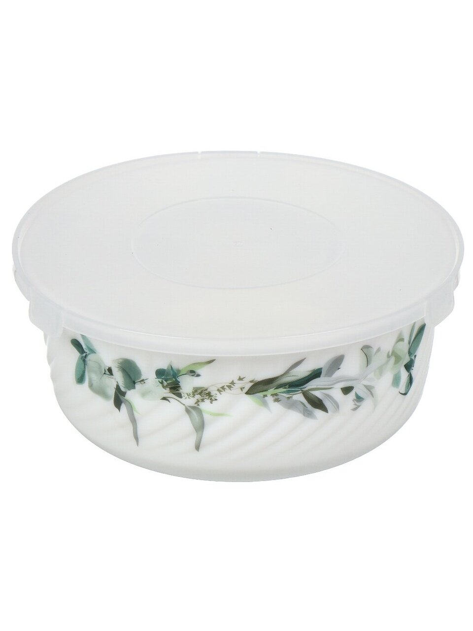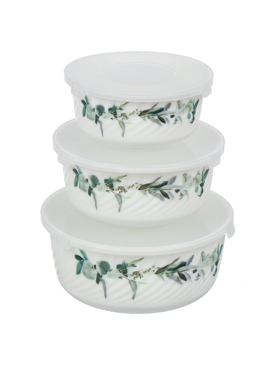 В наборе три круглых миски: 14 см (0.5 л), 16 см (0.8 л), 19 см (1.4 л), высота каждой — 9 см, все с крышками, дизайн «Эвкалипт», цвет белый.