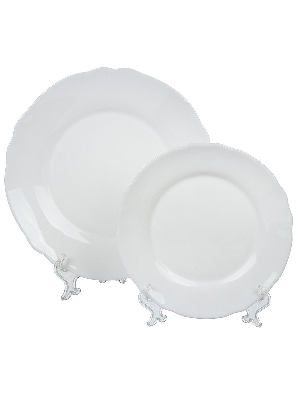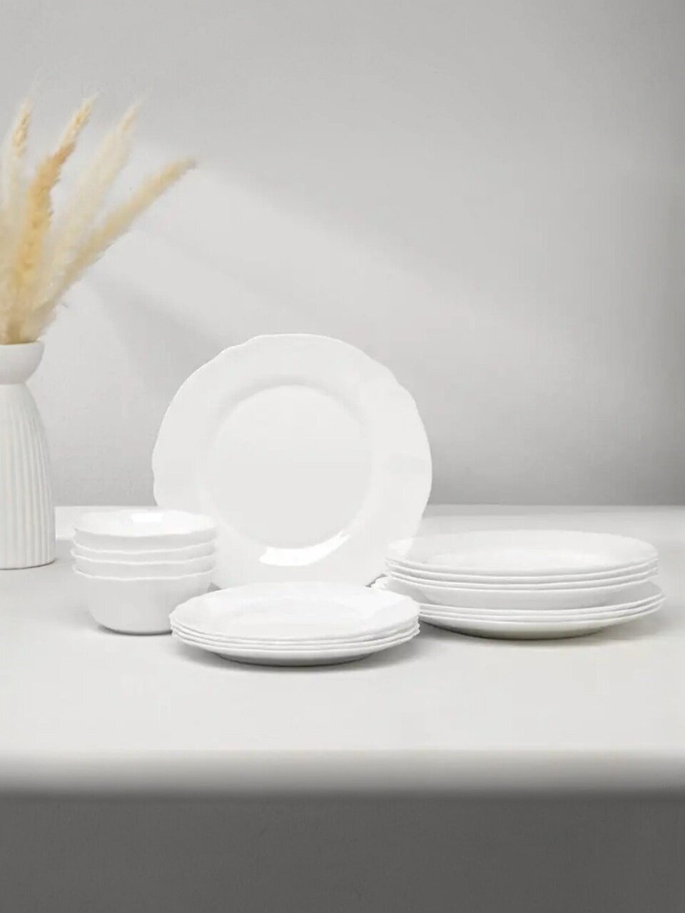 В наборе 16 предметов из стеклокерамики, вес — 4,9 кг, цвет — белый, можно использовать в микроволновке и посудомоечной машине.