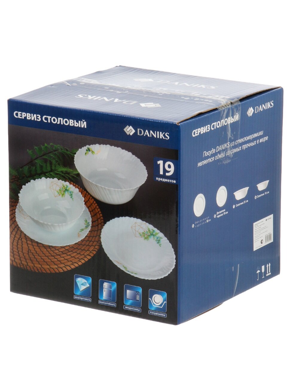 В комплекте 19 предметов из белой стеклокерамики: сервиз рассчитан на 6 персон, подходит для ежедневного и праздничного стола.