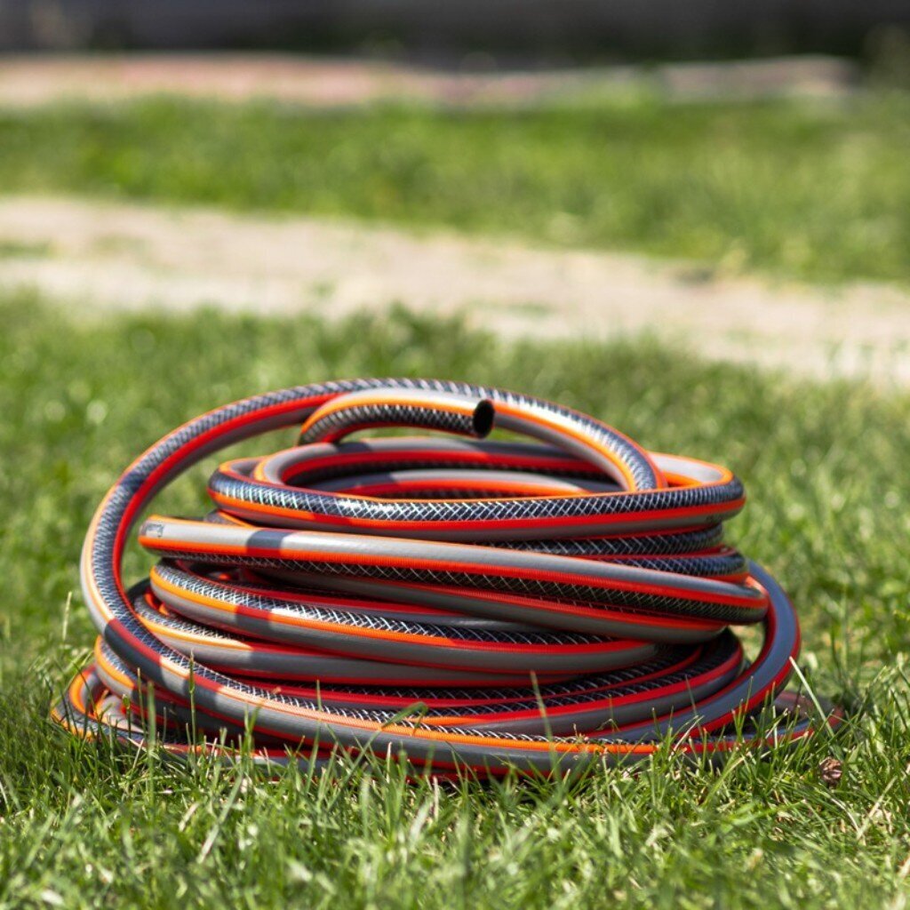 - Длина шланга составляет 25 метров, что делает его идеальным инструментом для полива садовых участков и транспортировки различных жидкостей, включая пищевые продукты.