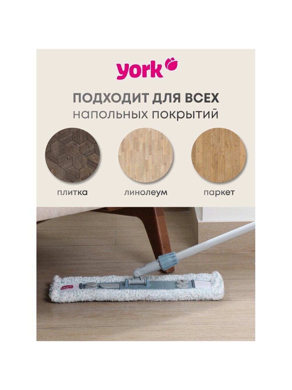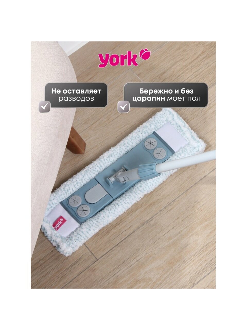Часто спрашивают: «Как выбрать швабру для пола с кафелем или ламинатом?» — оптимальное решение это плоская модель с микрофиброй, как у York Magnetic. В отличие от классических верёвочных швабр, она лучше справляется с пылью и не царапает поверхность. Телескопическая алюминиевая ручка облегчает уборку под мебелью и в углах, а длина 145 см подходит для пользователей любого роста.
