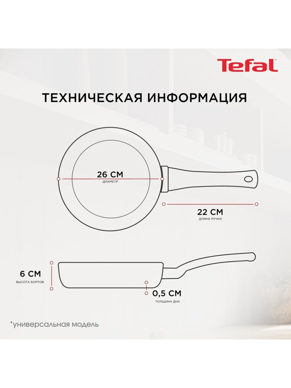 Диаметр сковороды — 26 см, высота борта — 50 мм. Это позволяет готовить как порционные блюда, так и большие семейные завтраки.