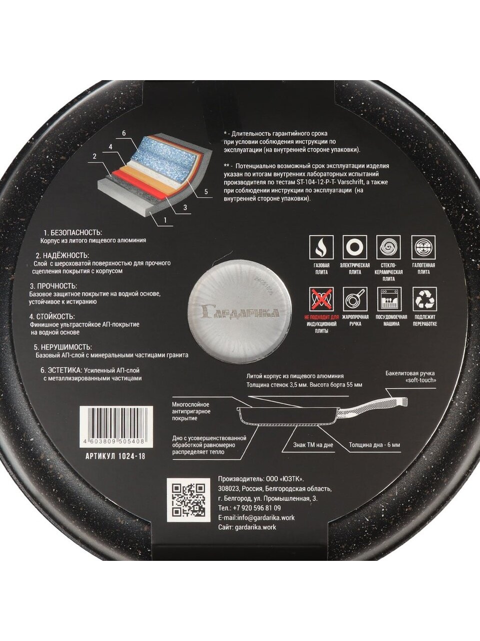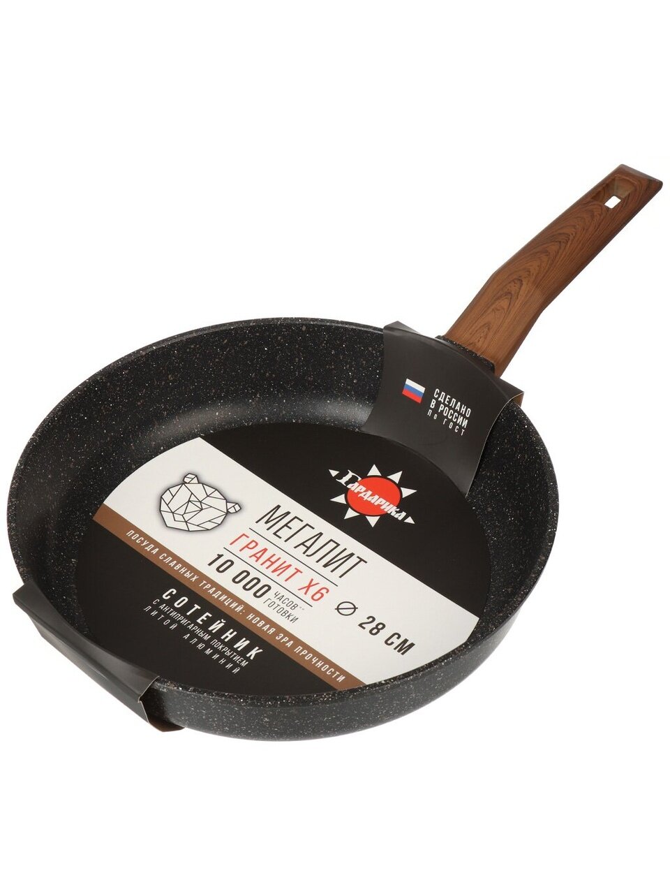 Сковорода Гардарика Мегалит 18, 28 см — литой алюминий, антипригарное гранитное покрытие, soft-touch ручка. Идеальный выбор для вкусных блюд дома и на даче.