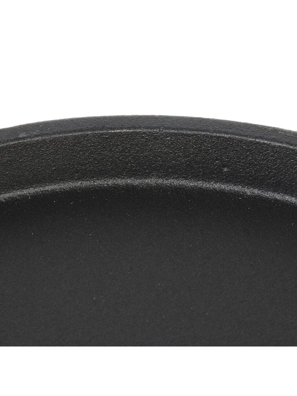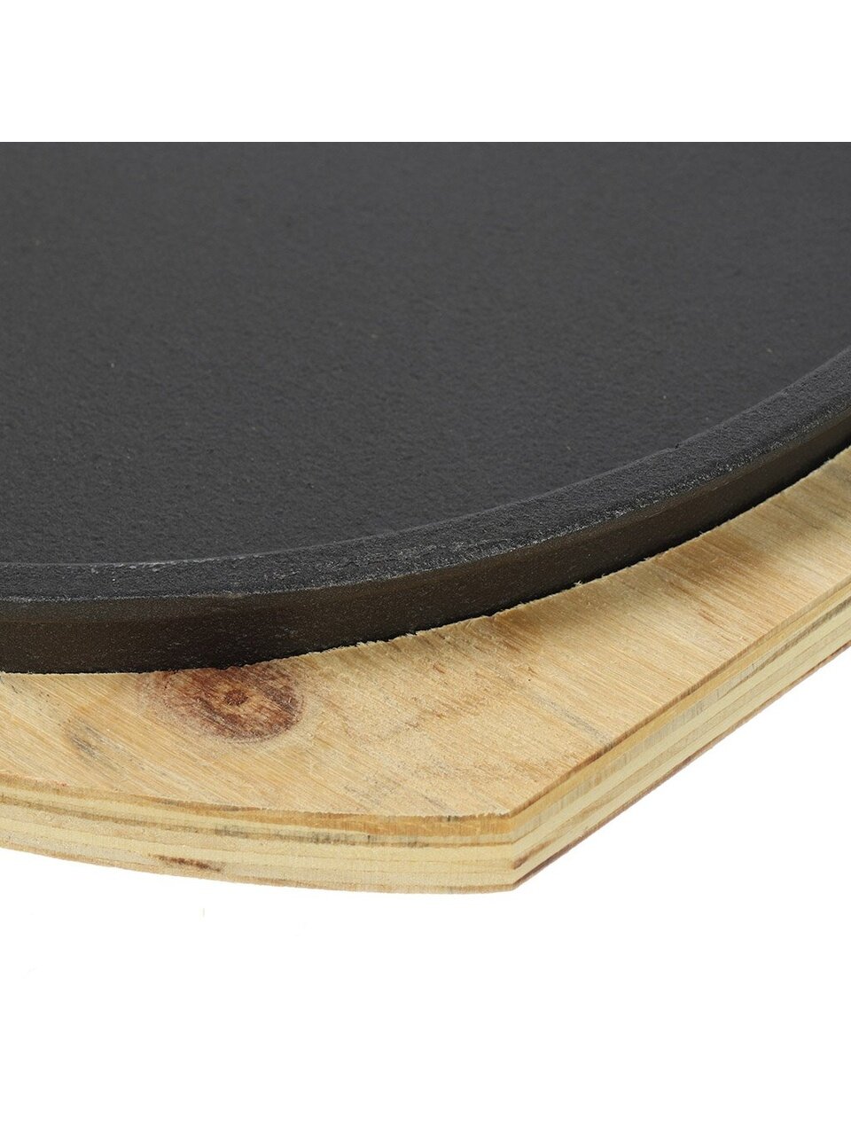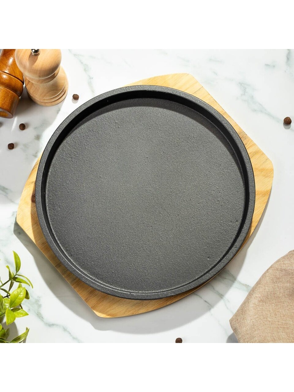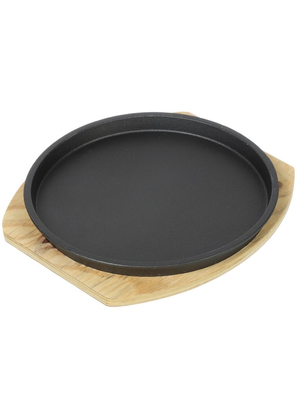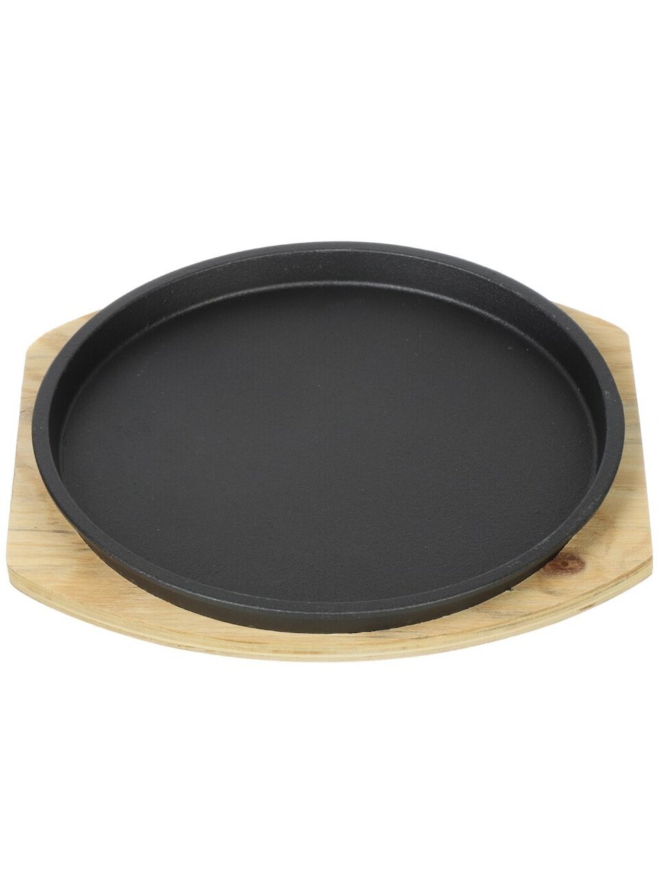 Чугунная сковорода 25.6х2 см с бамбуковой подставкой Y4-8876: жарьте мясо, рыбу и овощи на открытом огне или дома — долговечно и без вредных покрытий.