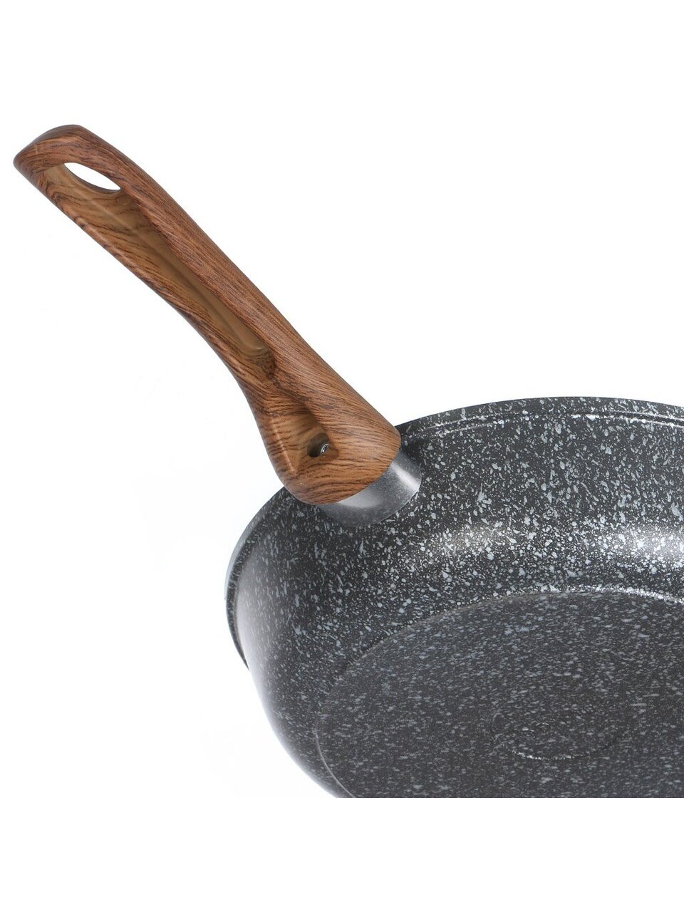 В отличие от тонких штампованных сковород, эта модель держит тепло дольше, не деформируется и подходит для интенсивного использования. Если вы ищете, чем отличается гранитное покрытие от обычного тефлона — гранитный слой прочнее, устойчив к царапинам и не выделяет вредных веществ. Как использовать сковороду для разных блюд? Готовьте всё: от стейков до овощей, уверенно переворачивайте продукты — ничего не прилипает.