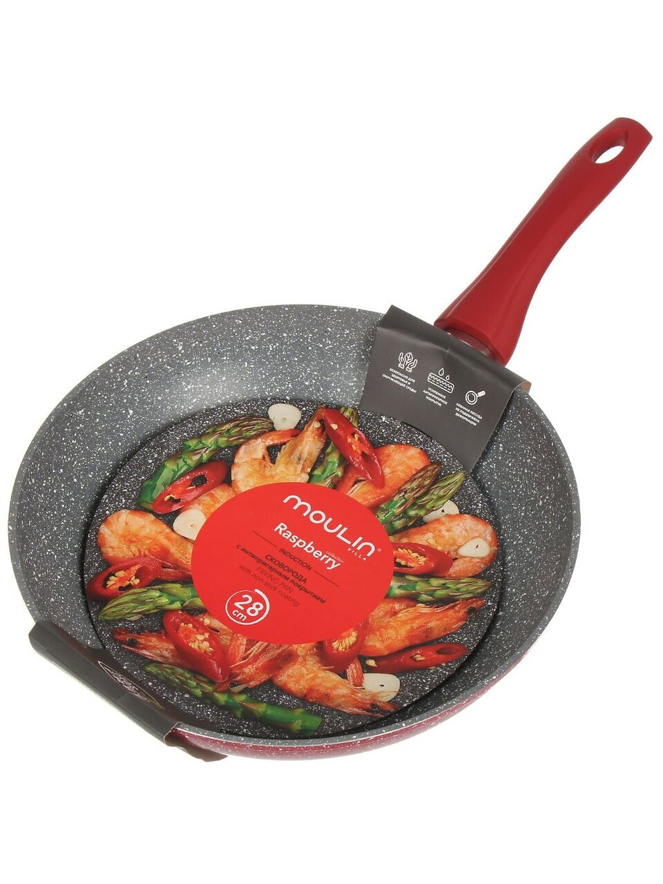 Сковорода Moulin villa Raspberry 28 см — идеальный выбор для индукции и всех типов плит. Мраморное антипригарное покрытие, долговечность и яркий дизайн для вашей кухни.