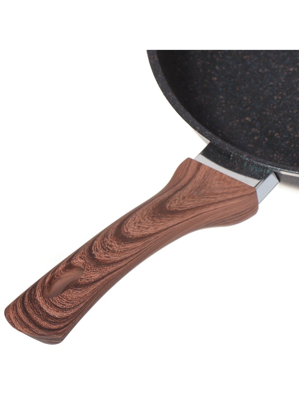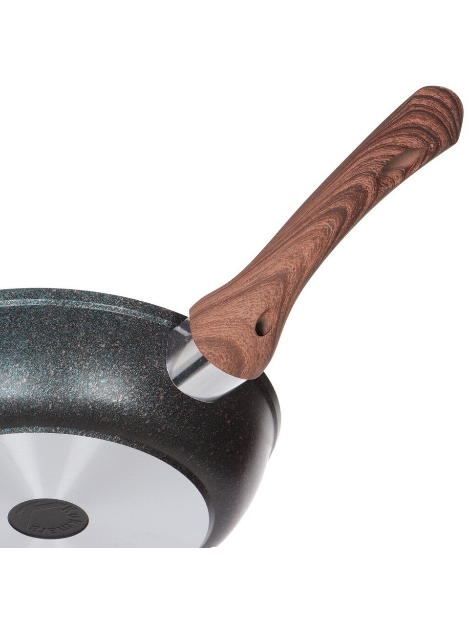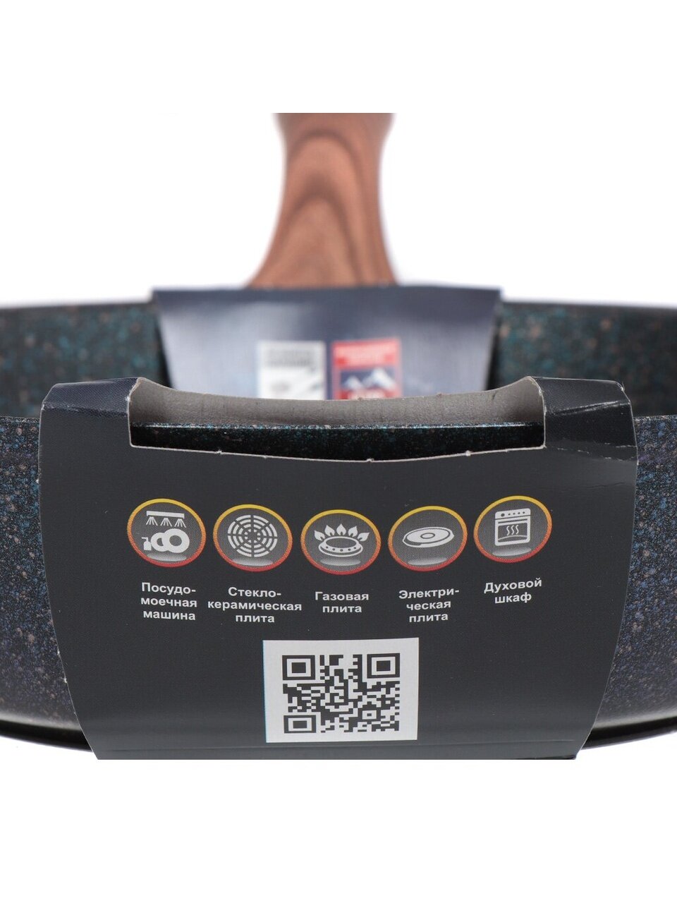 - Оптимальный диаметр 24 см, литой алюминий 4,5 мм, дно 6 мм — равномерный нагрев, срок службы до 3 лет по гарантии