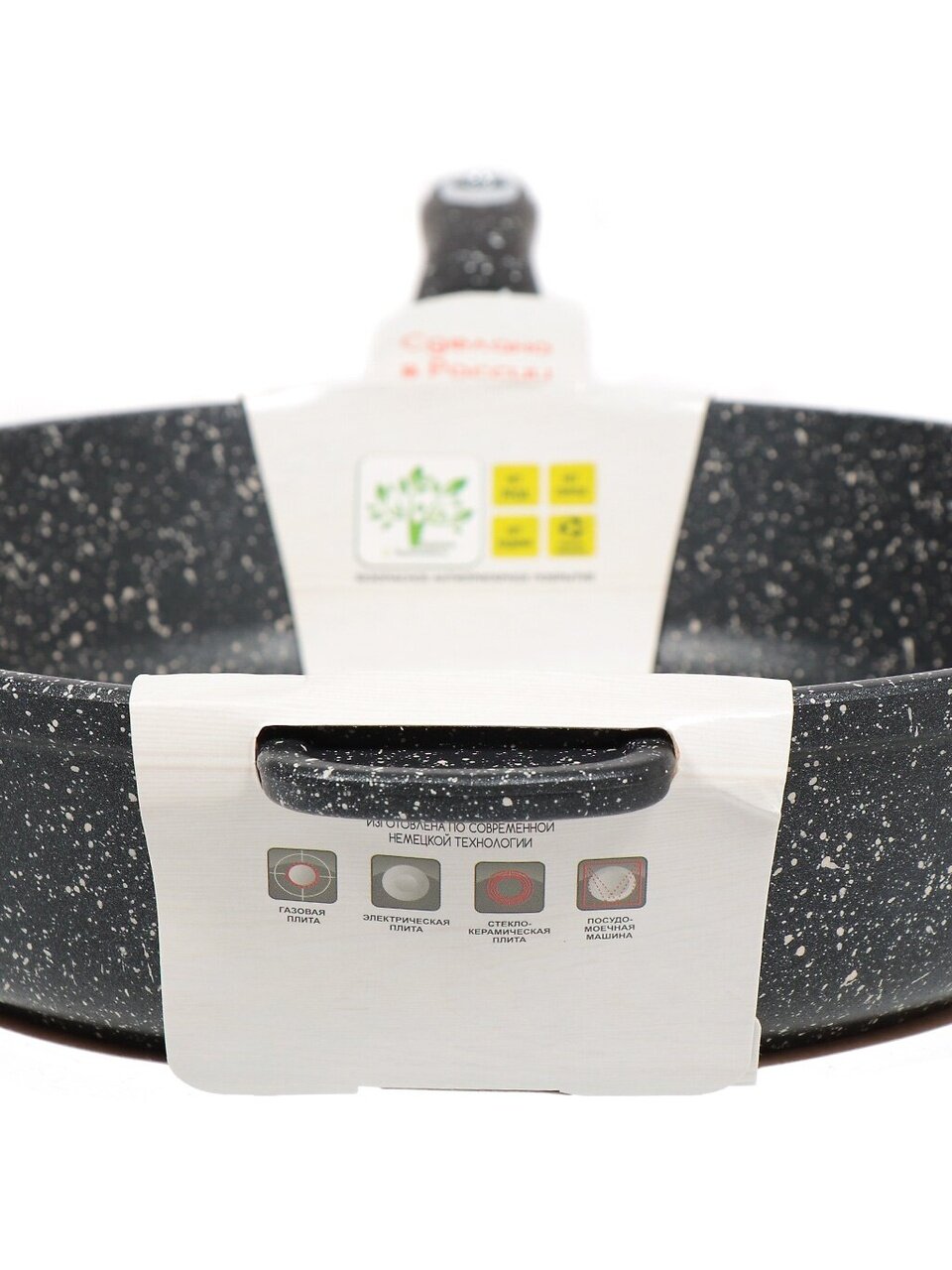 Сковорода литой алюминий 28 см Горница Гранит: антипригарное мраморное покрытие, толстое дно 6 мм, универсальна для дома и дачи — срок службы 5 лет.