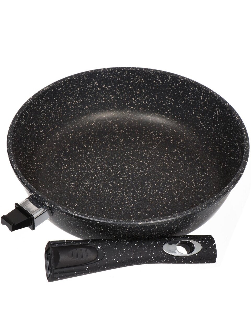 Сковорода из литого алюминия Горница Гранит — выбор тех, кто ищет долговечную посуду с мраморным антипригарным покрытием. Благодаря толстому дну (6 мм) и высоким бортикам (70 мм), вы сможете жарить мясо, готовить омлеты, оладьи или рыбу без риска пригорания. Часто спрашивают: «Подходит ли для духовки?» — да, съемная ручка позволяет использовать сковороду даже для запекания.