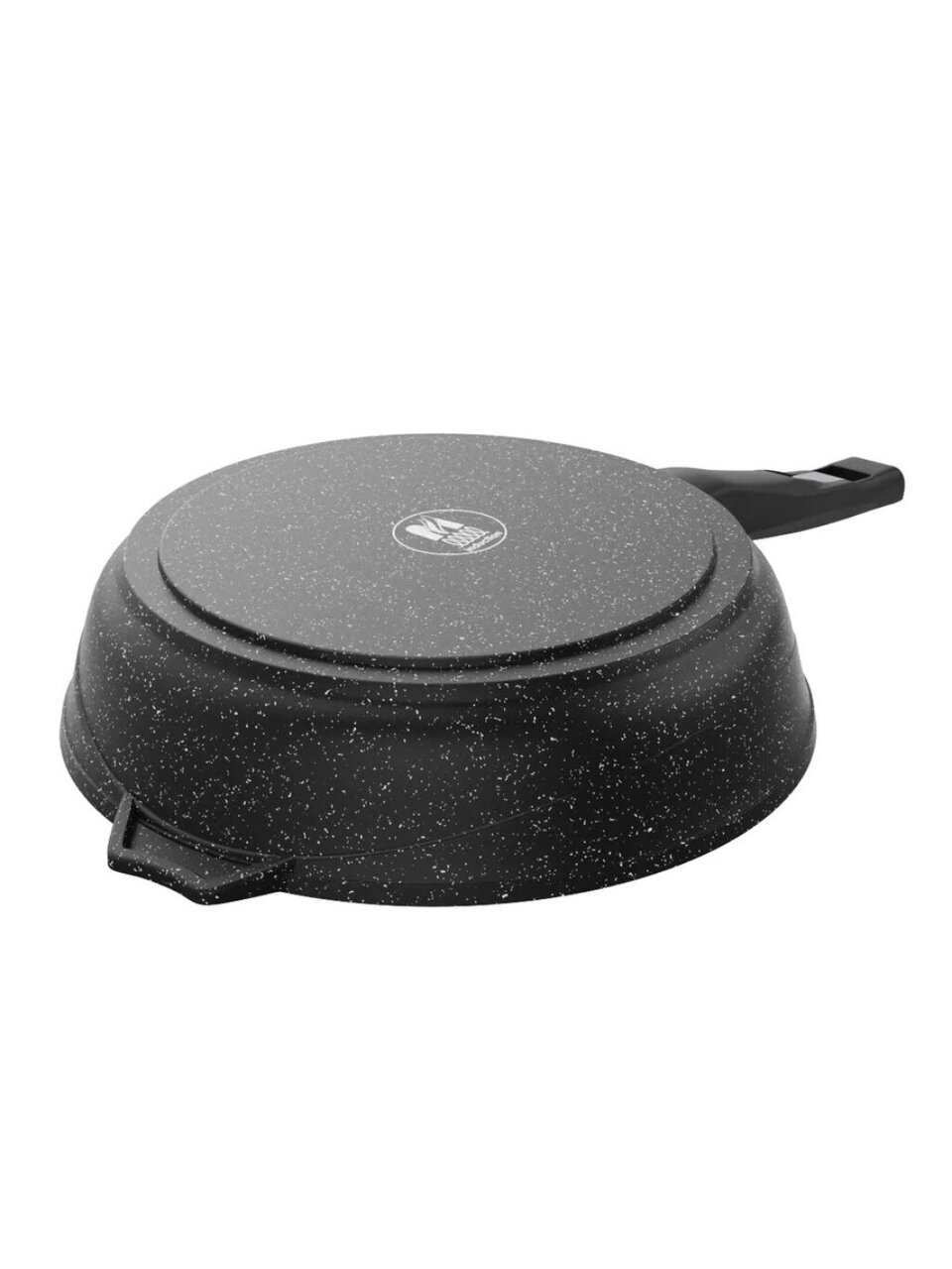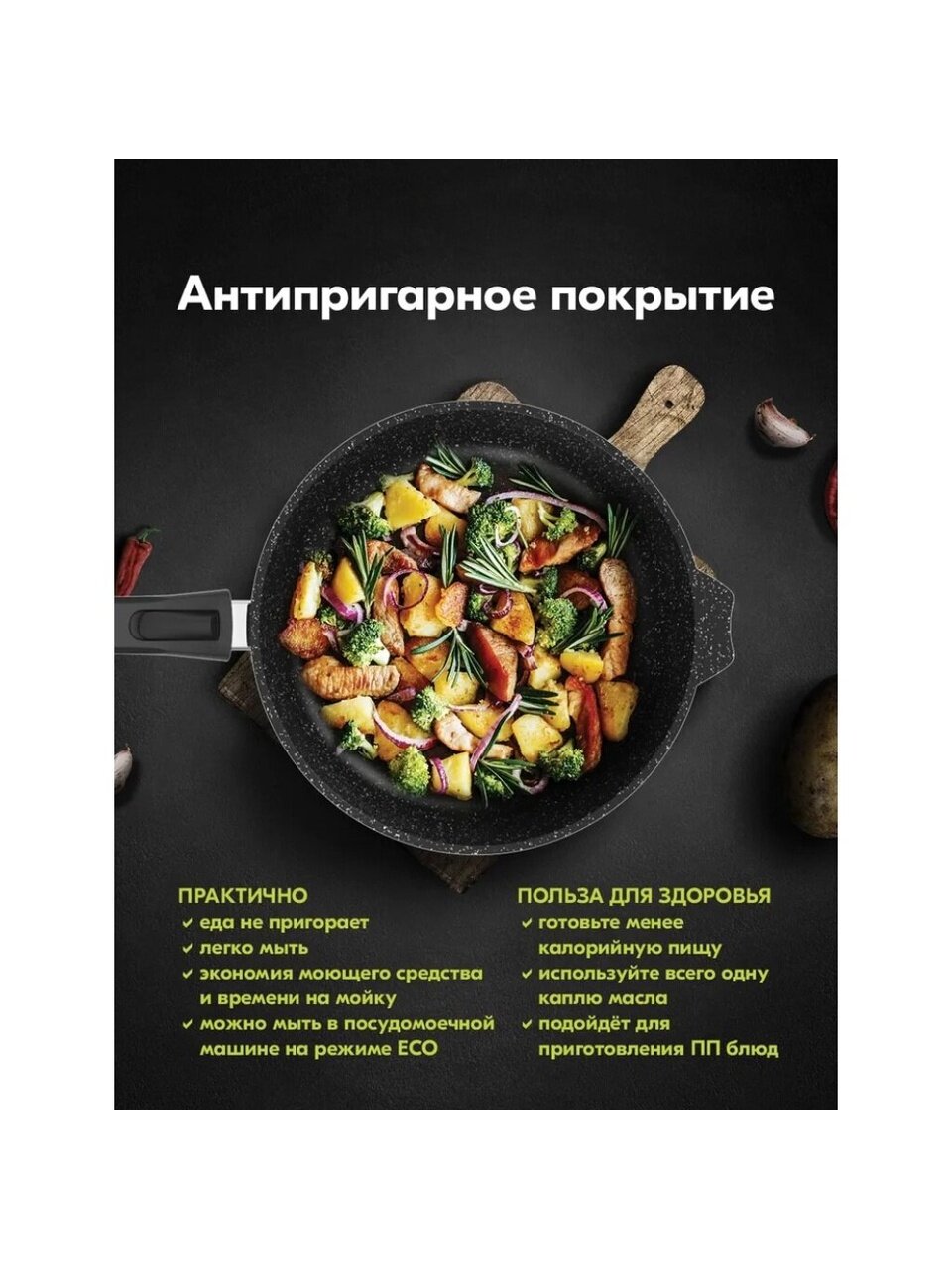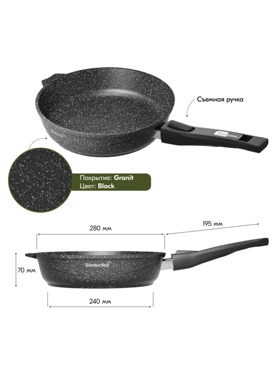 Сковорода литой алюминий 28 см Мечта Гранит black Induction Pro: антипригарное гранитное покрытие, съемная ручка, подходит для индукции — готовьте легко и без пригорания.