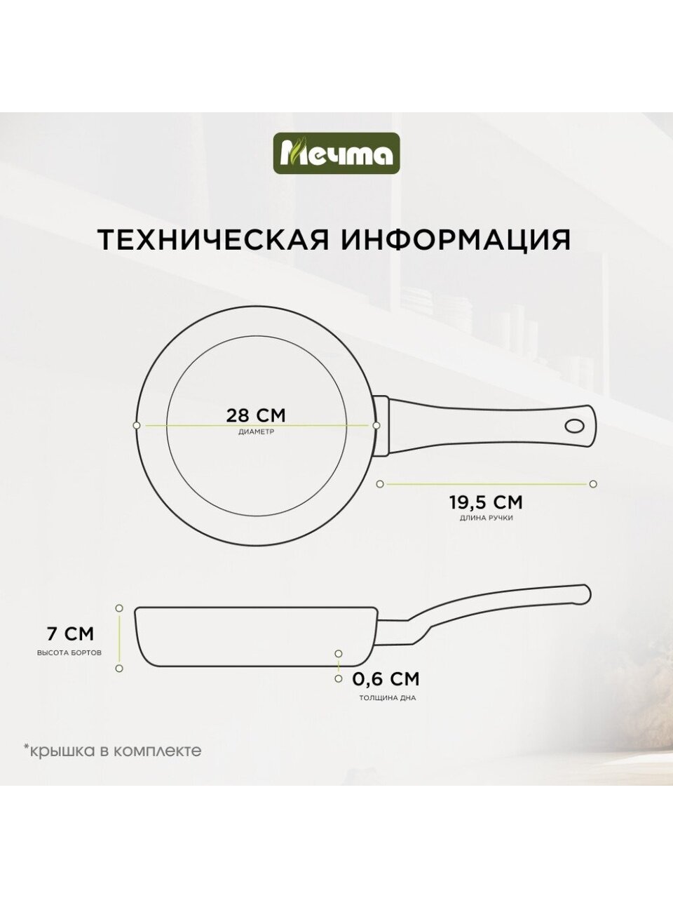 Вес — 1,58 кг, диаметр — 28 см, высота борта — 70 мм, толщина дна — 6 мм, толщина стенок — 4 мм. Это обеспечивает прочность, вместительность и равномерный нагрев для любых блюд.