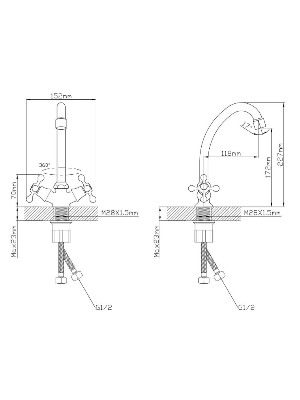 Высота излива — 17,2 см, длина — 11,8 см. Излив поворотный и высокий, что удобно для мытья посуды и наполнения больших ёмкостей.