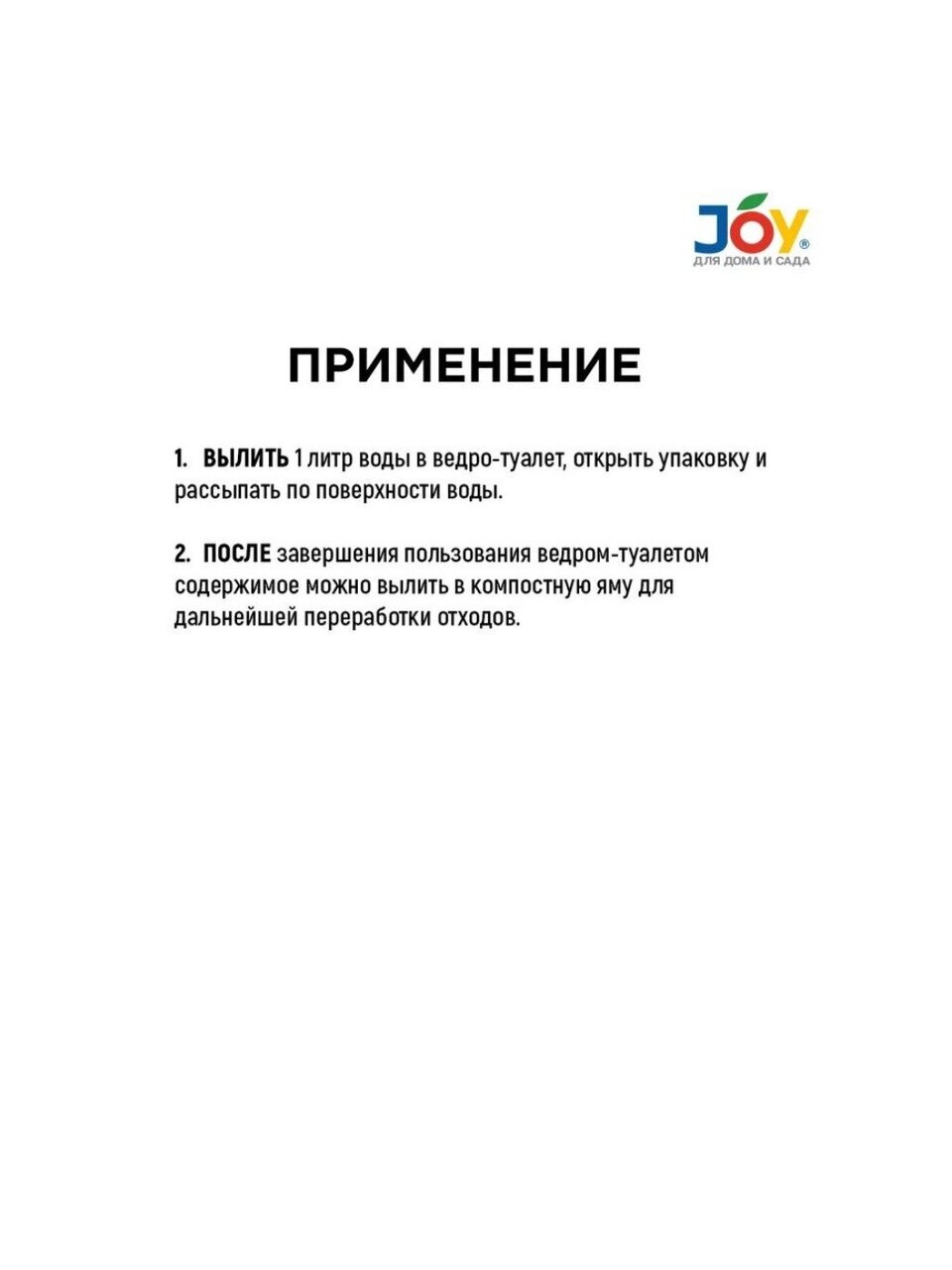 Способ применения: Вылить 1 литр воды в ведро-туалет, открыть упаковку, рассыпать по поверхности воды. Запах исчезает через 10-15 минут. После завершения пользования ведром-туалетом содержимое можно вылить в компостную яму для дальнейшей переработки отходов.