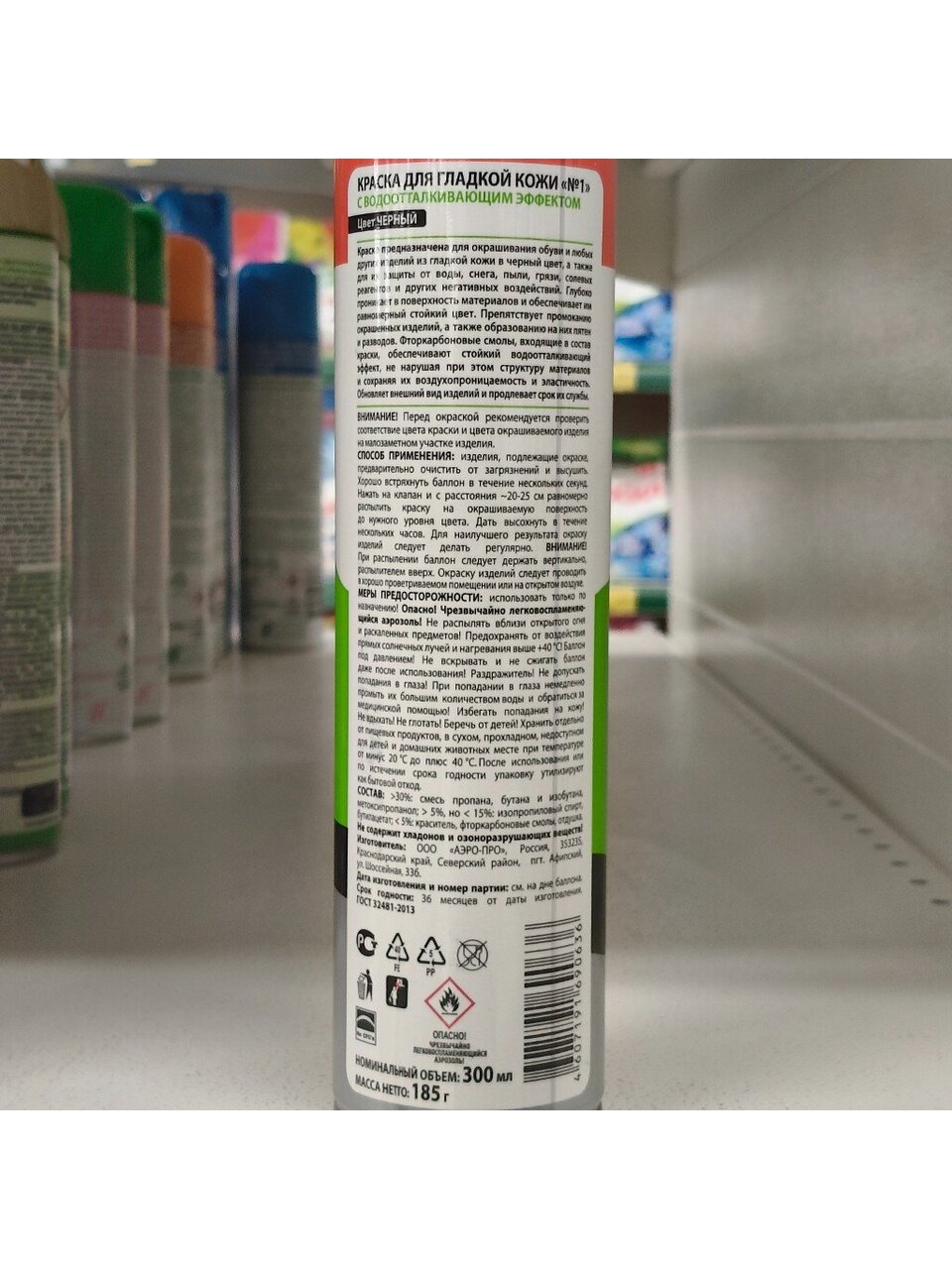 Краска для обуви предназначена для окрашивания обуви и любых других изделий из гладкой кожи в черный цвет, а также для их защиты от воды, снега, пыли, грязи, солевых реагентов и других негативных воздействий. Глубоко проникает в поверхность материалов и обеспечивает им равномерный стойкий цвет. Краска для обуви водостойкая препятствует промоканию окрашенных изделий, а также образованию на них пятен и разводов. Фторкарбонатовые смолы, входящие в состав краски, обеспечивают стойкий водоотталкивающий эффект не нарушая при этом структуру материалов и сохраняя их воздухопроницаемость и эластичность. Спрей краска для обуви обновляет внешний вид изделий и продлевает срок их службы.