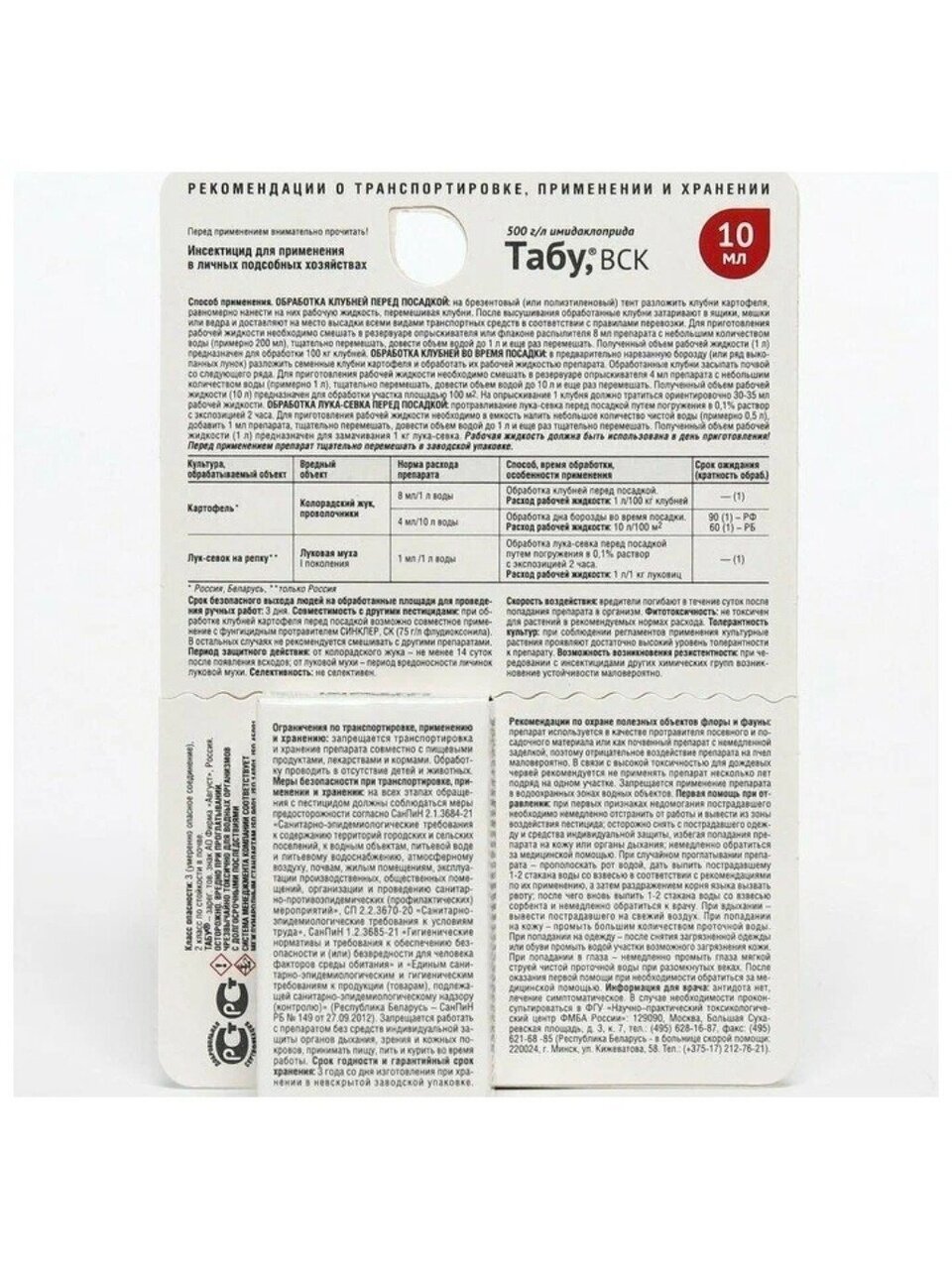 Препарат обладает высокой эффективностью независимо от погодных условий, в рекомендуемых дозах не токсичен для пчел, дождевых червей, птиц и млекопитающих. Расход Табу очень экономичен: 10 мл препарата хватает на 125 кг картофеля.
