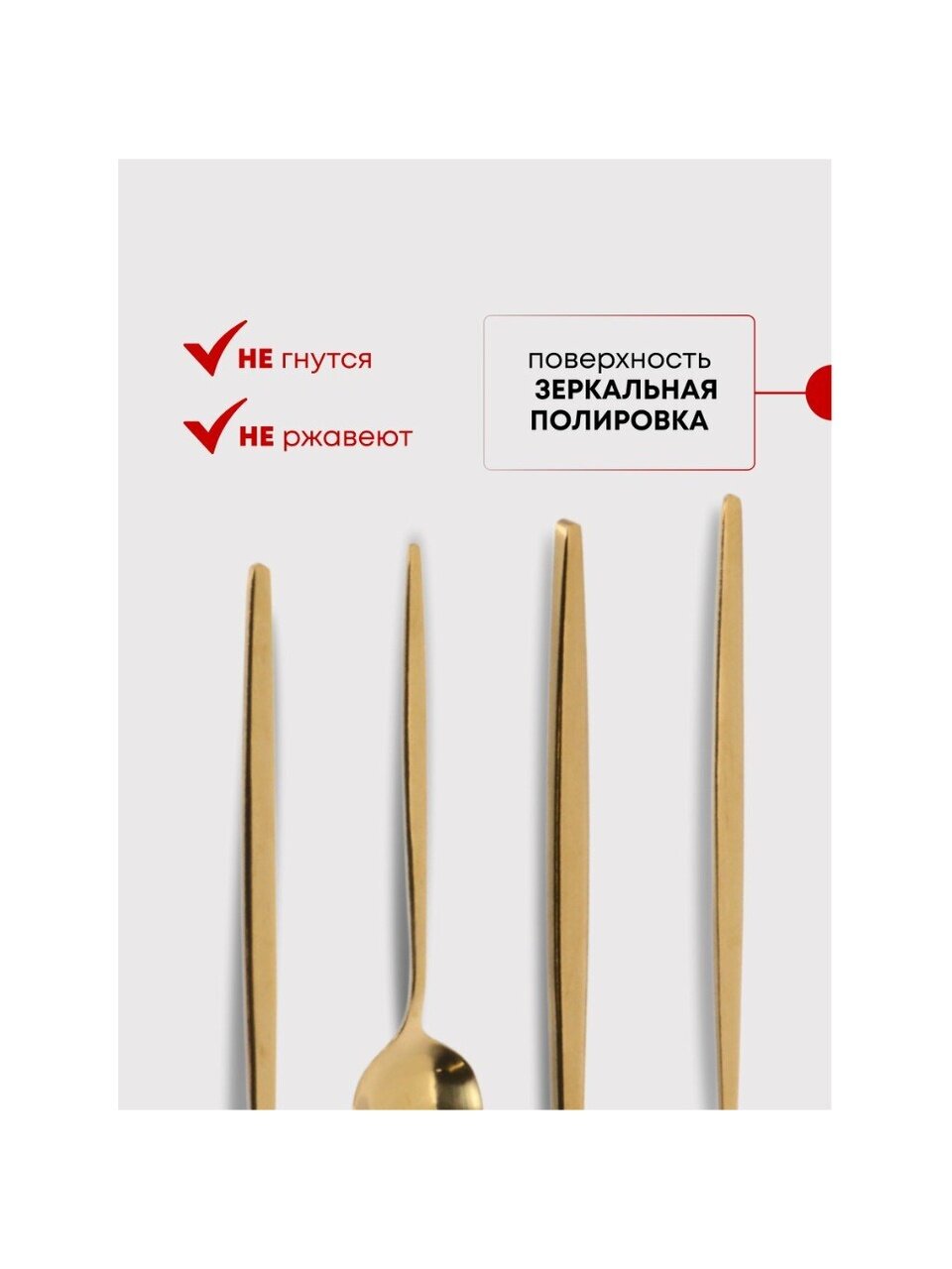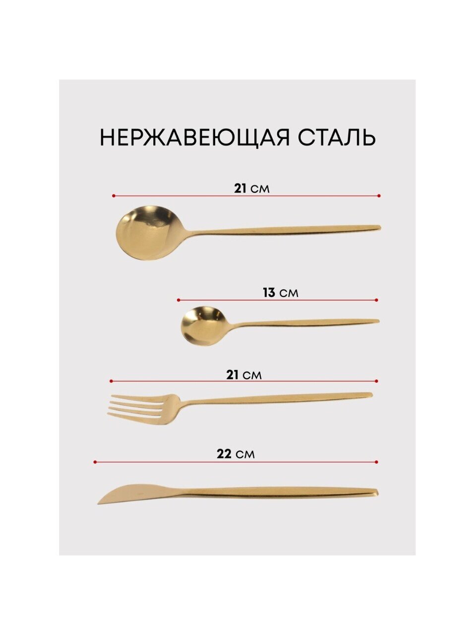 В комплекте 4 предмета для одной персоны: нож, вилка, ложка и чайная ложка, длина каждого — 22 см.