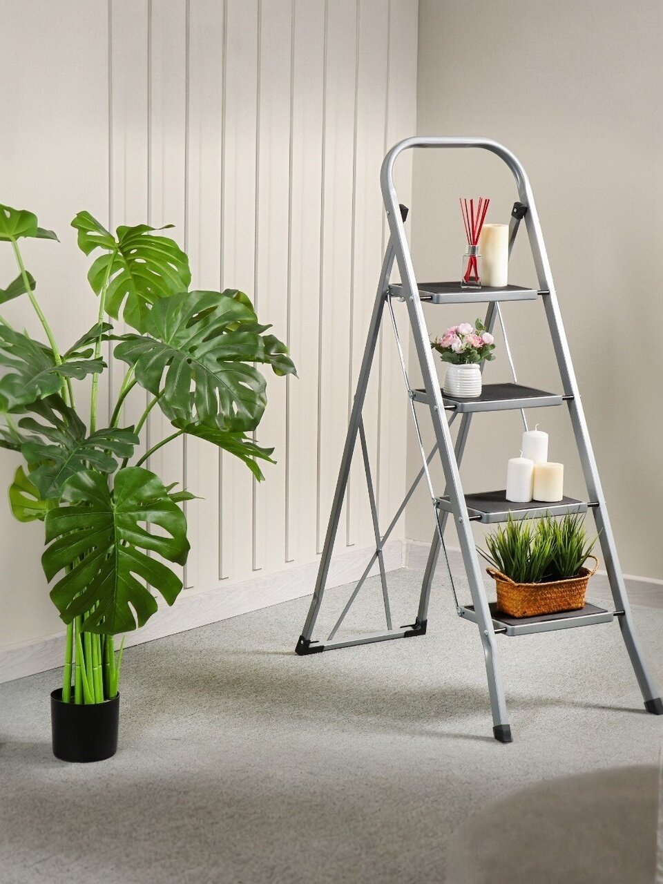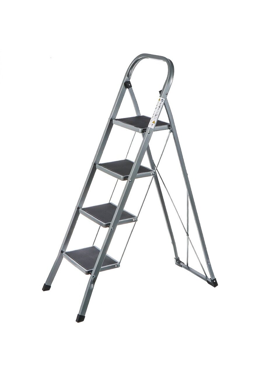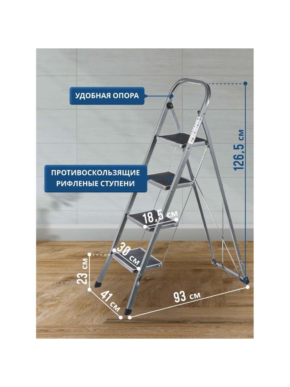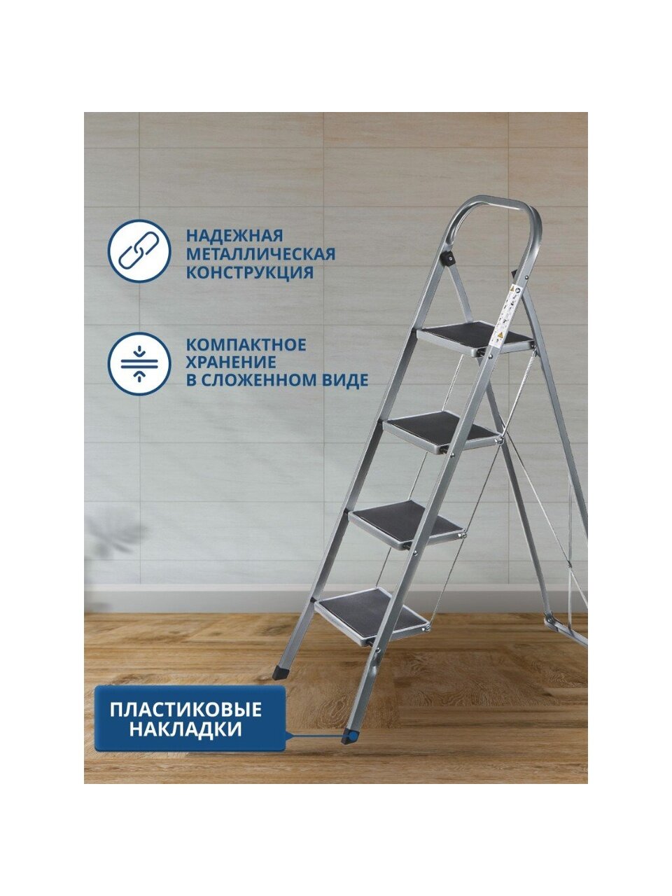 - Стремянка имеет четыре ступени, что делает ее удобной для выполнения работ на разных высотах. Вы можете легко достать до высоких полок, заменить лампочку или выполнить другие работы, не используя дополнительные инструменты.