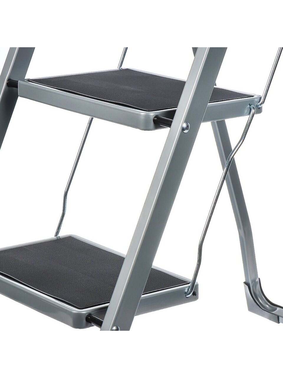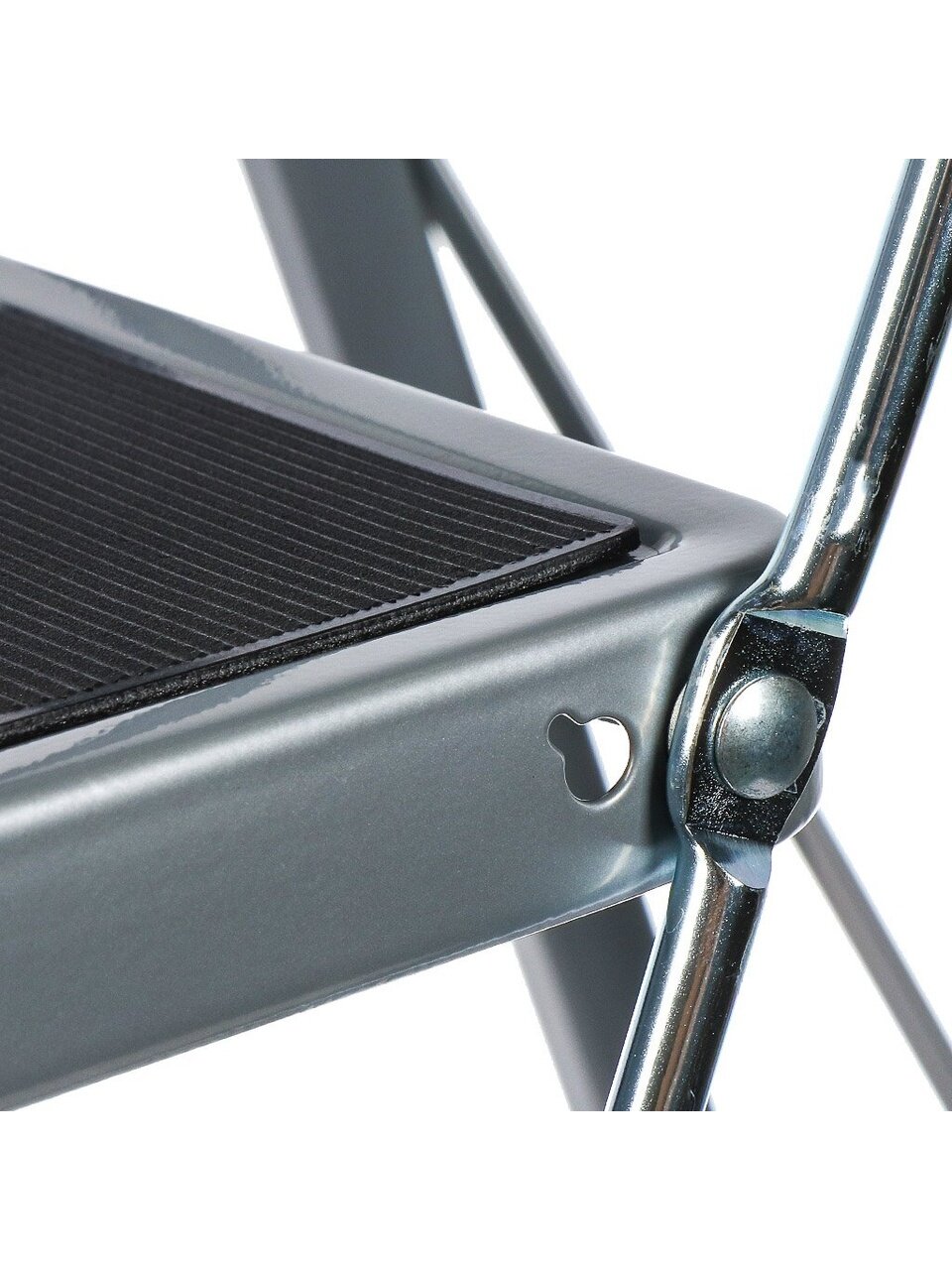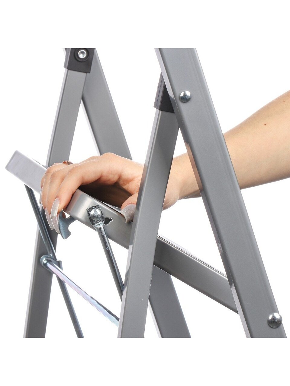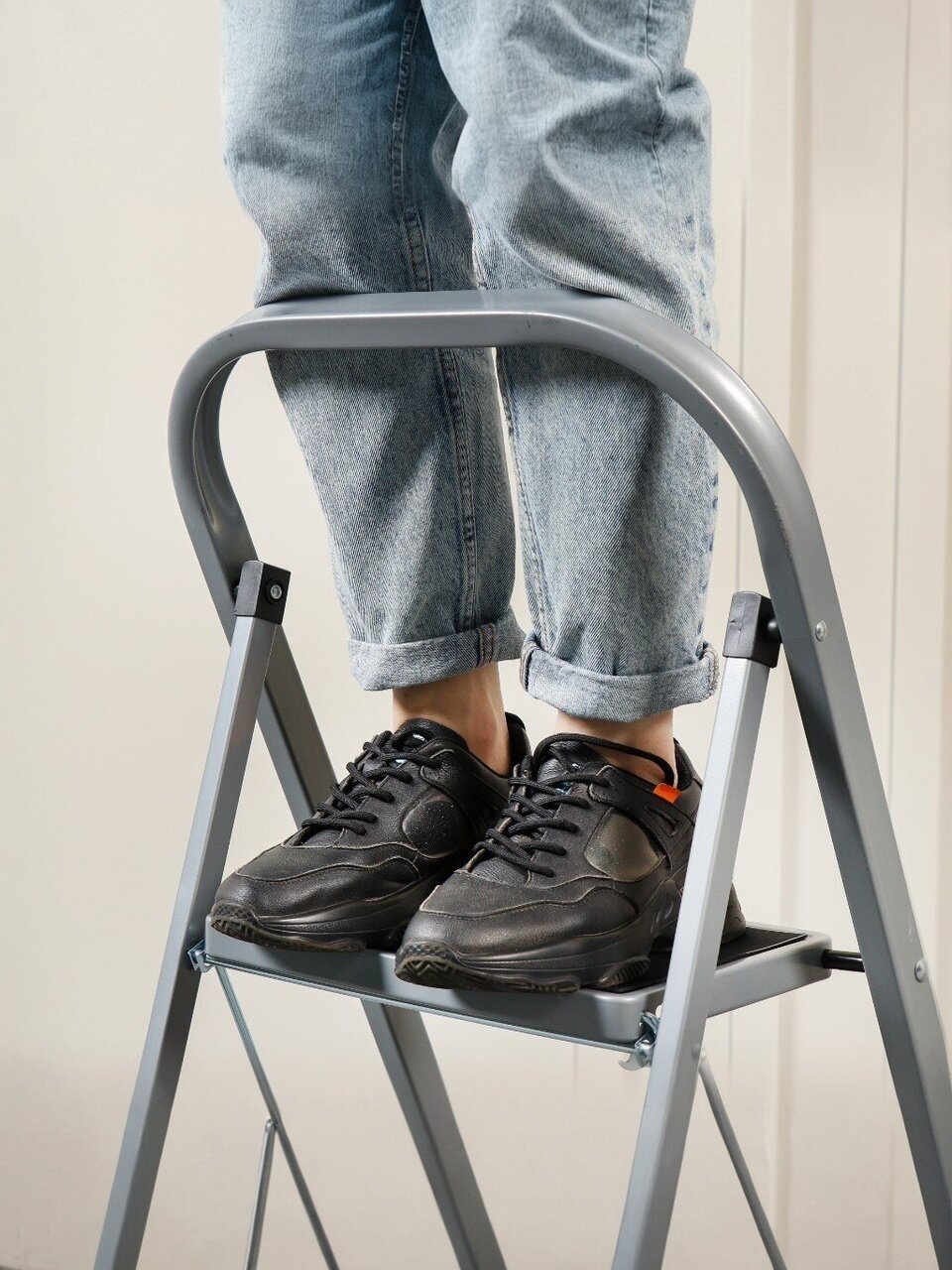 - Стремянка имеет четыре ступени, что делает ее удобной для выполнения работ на разных высотах. Вы можете легко достать до высоких полок, заменить лампочку или выполнить другие работы, не используя дополнительные инструменты.