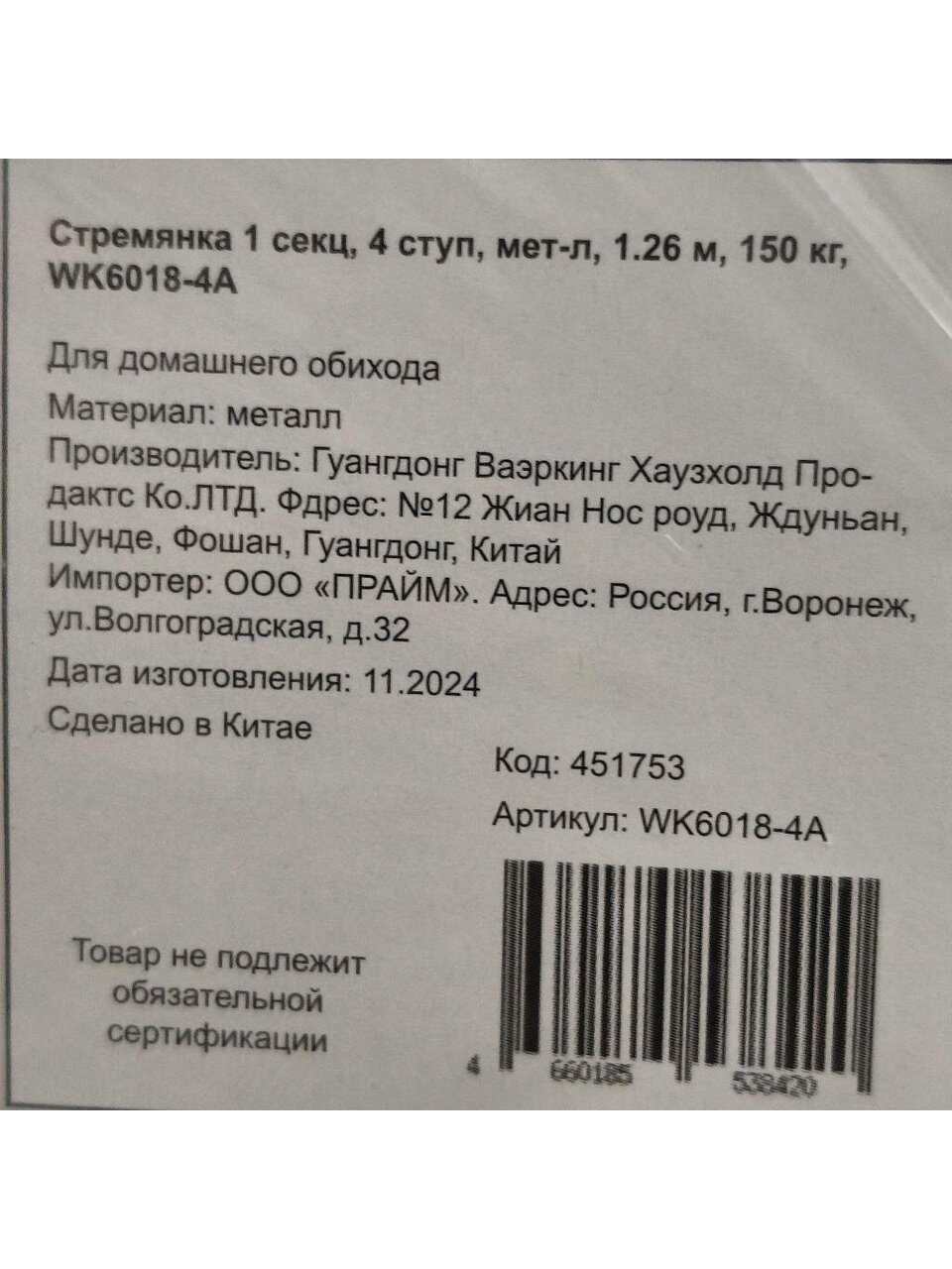 Вы можете приобрести «Стремянка 1 секция, 4 ступени, металл, 1.26 м, 150 кг, WK6018-4A» и другие товары в нашем интернет-магазине в Железногорске по низким ценам и с бесплатным самовывозом.
