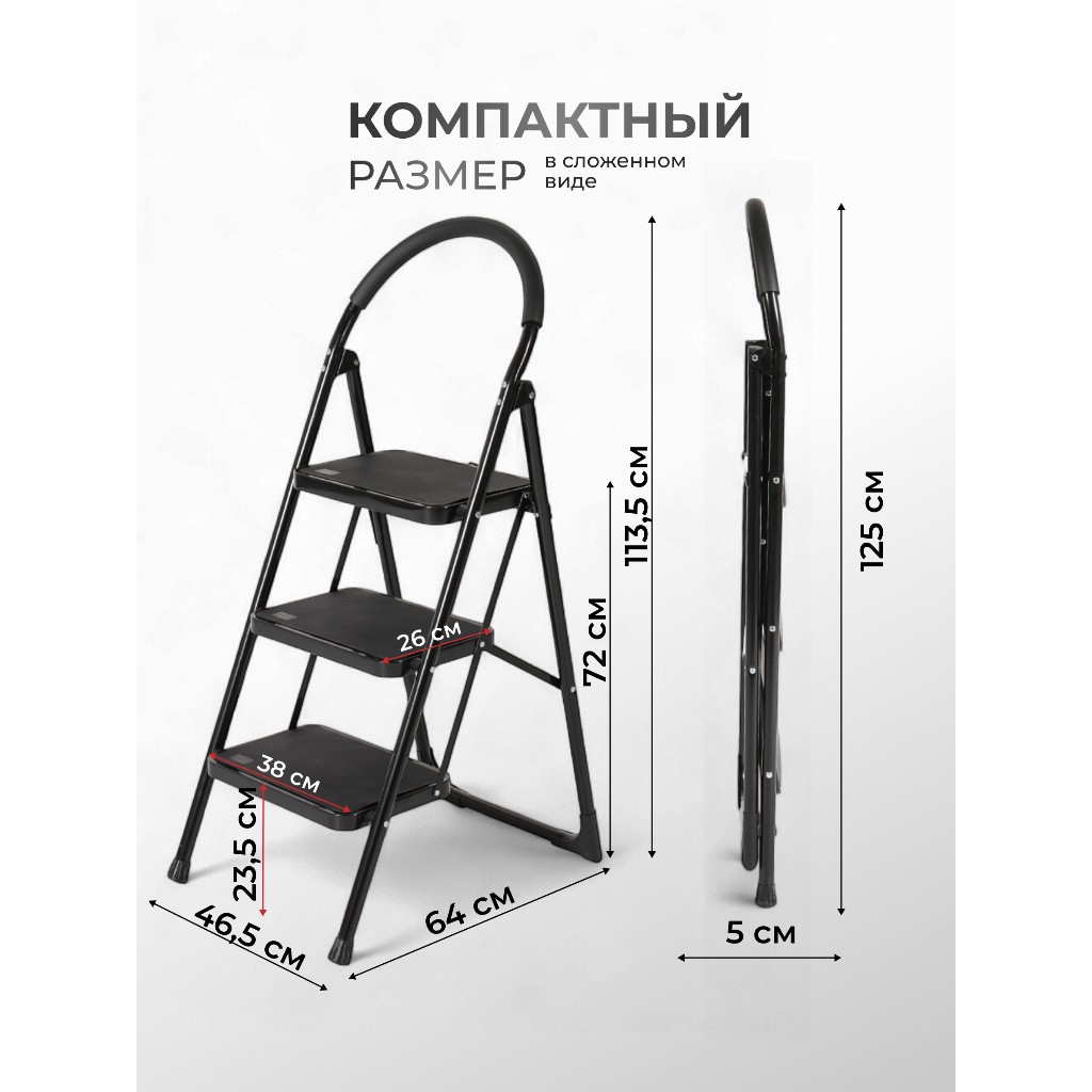 Стремянка изготовлена из высококачественной стали, что гарантирует устойчивость к износу и механическим повреждениям. Лаконичный дизайн и нейтральный цвет позволяют использовать стремянку в любом интерьере, не нарушая гармонию пространства. Размеры 115х64х45.5 см обеспечивают комфортную высоту для выполнения большинства бытовых задач, будь то замена лампочки, уборка на верхних полках или проведение мелкого ремонта.