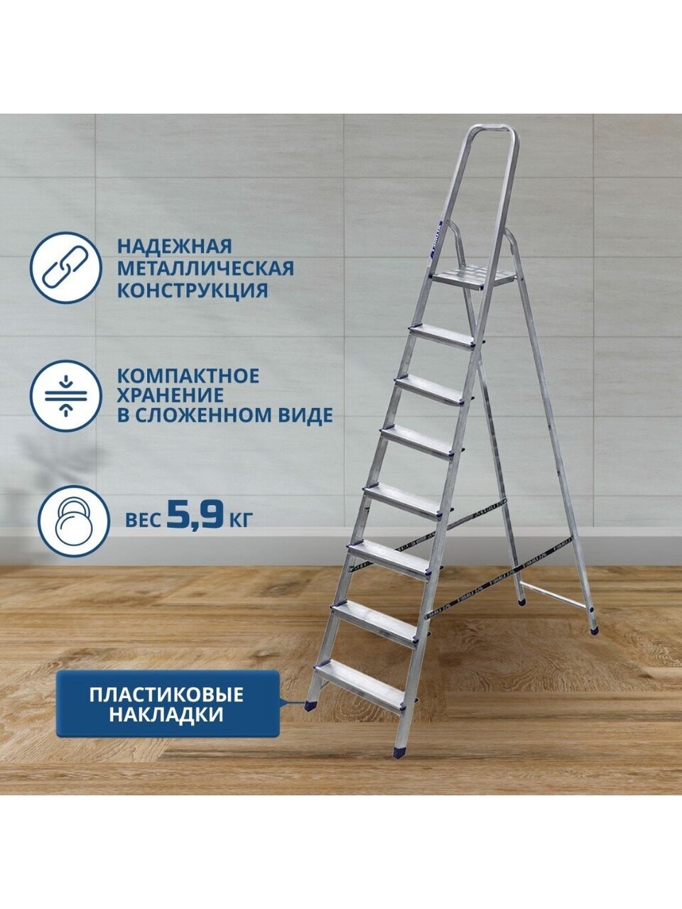 - 8 широких металлических ступеней, обеспечат удобство и безопасность подъема и спуска.