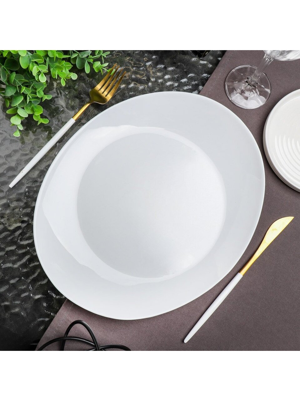 Диаметр тарелки составляет 31.3 см, форма — овальная. Это оптимальный размер для подачи горячих блюд, закусок и сервировочных композиций.