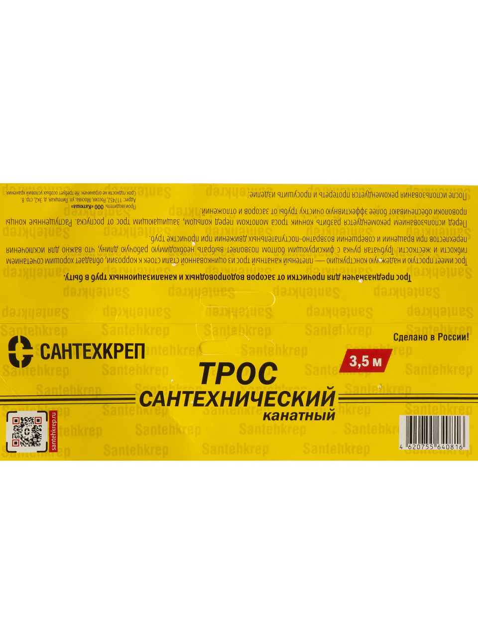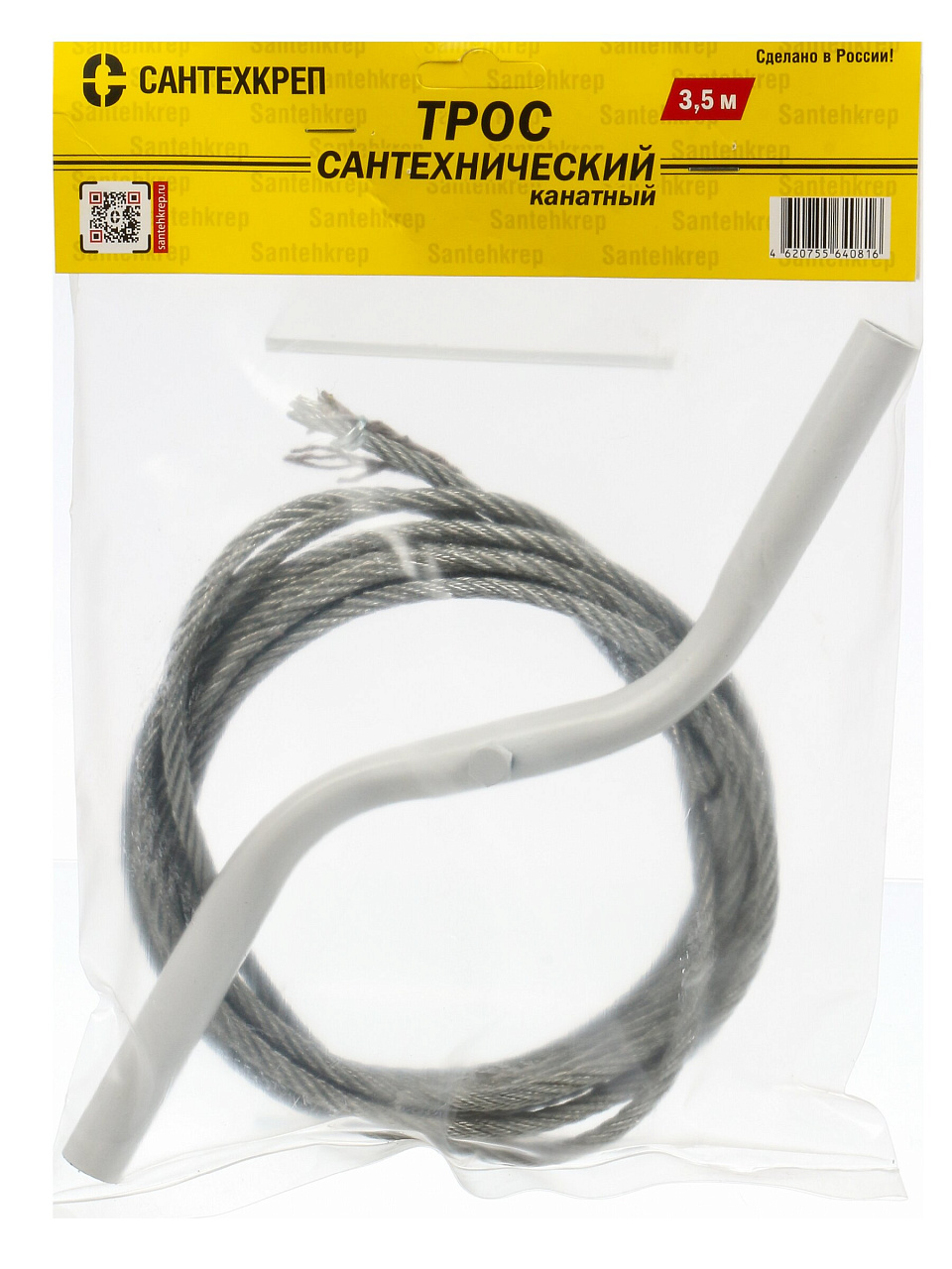 Трос канализационный d 6 мм, 3.5 м СантехКреп — быстрое решение сложных засоров: удобство, надежность, оптимальная длина для дома и дачи.