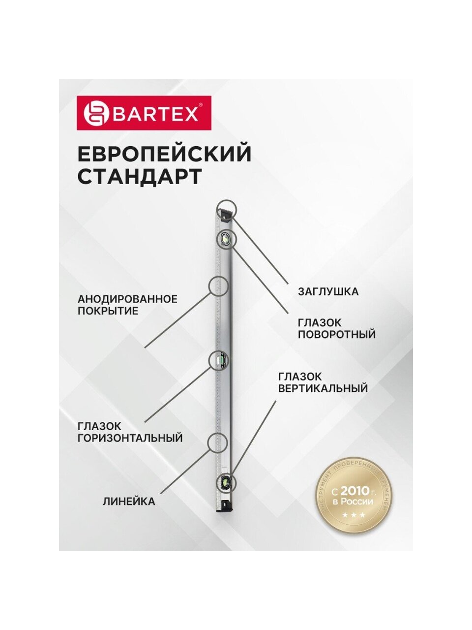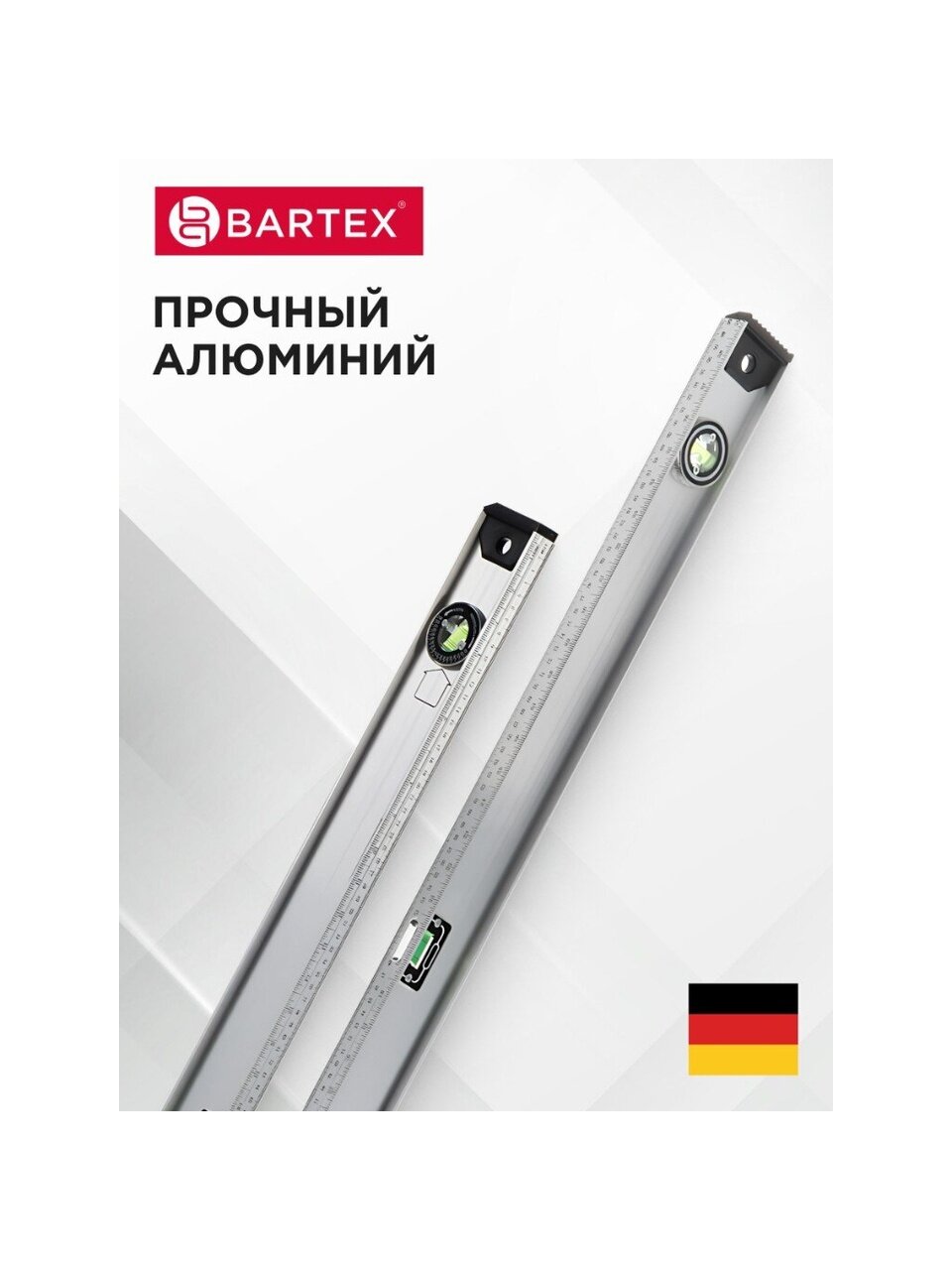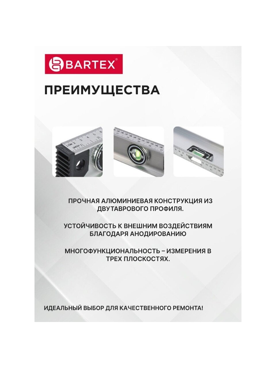 Работать с алюминиевым уровнем Bartex невероятно комфортно. Благодаря наличию 3 глазков Вы сможете проводить измерения по горизонтали, вертикали и под углом 45 градусов. Это сводит к минимуму вероятность отклонений, приближая Ваш ремонт к идеальным показателям.
