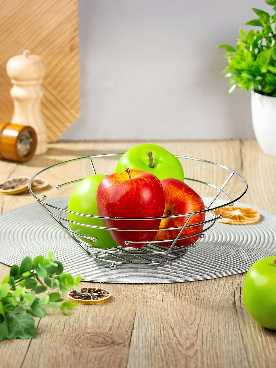 Стильная металлическая корзина для фруктов впишется в любой интерьер Вашего дома и всегда будет радовать Вас и Ваших гостей. Корзина имеет оригинальный геометрический дизайн.