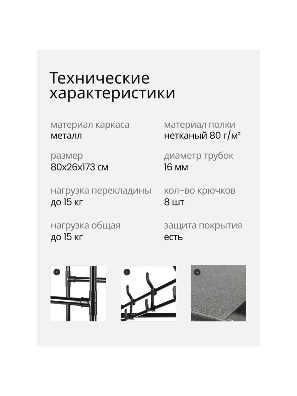 Эта вешалка не только помогает организовать пространство, но и добавляет стильный акцент в интерьер. Благодаря компактным размерам (80х26х173 см), она легко вписывается даже в небольшие помещения, не занимая много места. Черный цвет изделия подчеркивает его элегантность и универсальность, гармонично сочетаясь с любым декором.