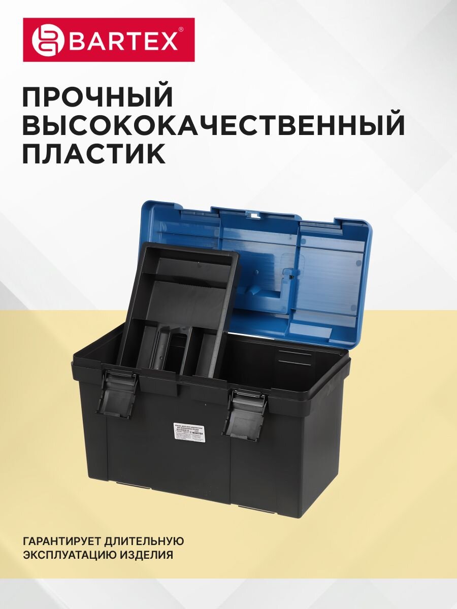 Ящик Bartex — это незаменимый помощник для любого мастера. Он выполнен из прочного материала, который обеспечивает надёжную защиту содержимого от повреждений и влаги. Внутри ящика есть несколько отделений для удобного размещения всего необходимого.