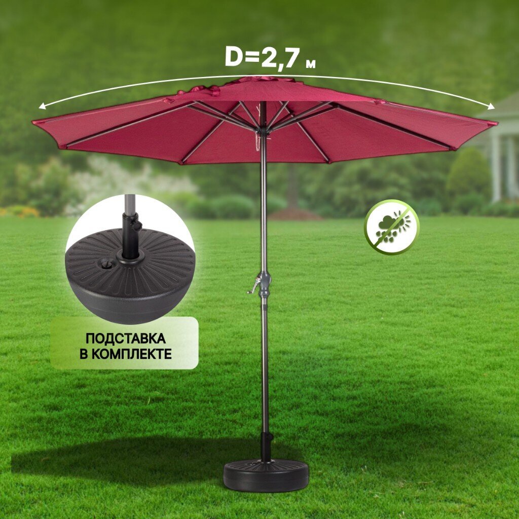 Садовый зонт 2.7х2.7 м бордо с подставкой 51х12х51 см C080018 — стильное и практичное решение для создания уютной зоны отдыха на даче, в саду или на террасе. Эффектный цвет бордо органично впишется в любой ландшафтный дизайн, добавив яркий акцент и подчеркнув индивидуальность пространства. Благодаря продуманной конструкции и прочным материалам зонт обеспечивает надежную защиту от солнца и создает комфортную тень в жаркие летние дни, позволяя наслаждаться свежим воздухом без лишних забот.